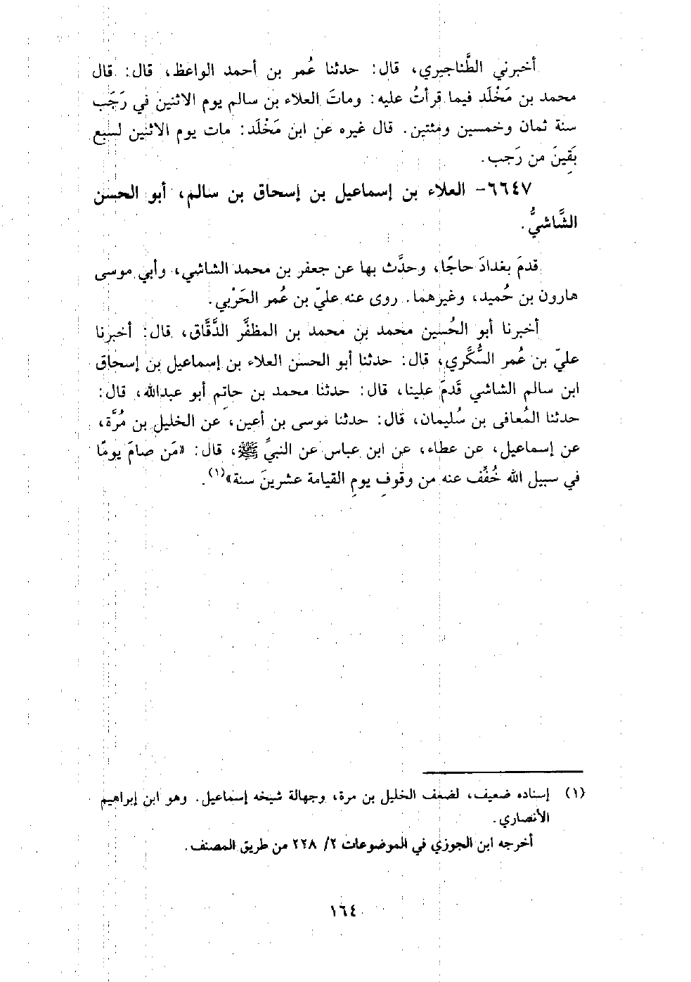 (4142) -[14: 164] أَخْبَرَنَا أَبُو الْحُسَيْنِ مُحَمَّدُ بْنُ مُحَمَّدِ بْنِ الْمُظَفَّرِ الدَّقَّاقُ، قَالَ: أَخْبَرَنَا عَلِيُّ بْنُ عُمَرَ السُّكَّرِيُّ، قَالَ: حَدَّثَنَا أَبُو الْحَسَنِ الْعَلاءُ بْنُ إِسْمَاعِيلَ بْنِ إِسْحَاقَ بْنِ سَالِمٍ الشَّاشِيُّ قَدِمَ عَلَيْنَا، قَالَ: حَدَّثَنَا مُحَمَّدُ بْنُ حَاتِمٍ أَبُو عَبْدِ اللَّهِ، قَالَ: حَدَّثَنَا الْمُعَافَى بْنُ سُلَيْمَانَ، قَالَ: حَدَّثَنَا مُوسَى بْنُ أَعْيَنَ، عَنِ الْخَلِيلِ بْنِ مُرَّةَ، عَنْ إِسْمَاعِيلَ، عَنْ عَطَاءٍ، عَنِ ابْنِ عَبَّاسٍ، عَنِ النَّبِيِّ صَلَّى اللَّهُ عَلَيْهِ وَسَلَّمَ قَالَ: " مَنْ صَامَ يَوْمًا فِي سَبِيلِ اللَّهِ خُفِّفَ عَنْهُ مِنْ وُقُوفِ يَوْمِ الْقِيَامَةِ عِشْرِينَ سَنَةً "