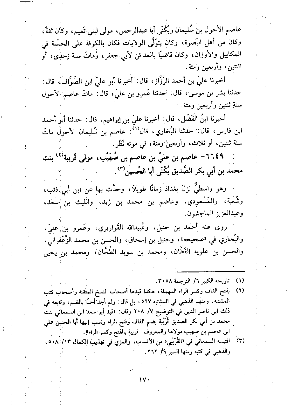 6649 - عاصم بْن علي بْن عاصم بْن صهيب، مولى قريبة بنت مُحَمَّد بْن أبي بكر الصديق يكنى أبا الحسين