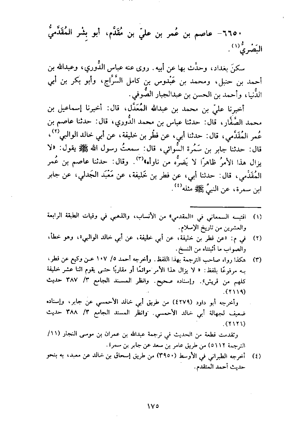 (4143) -[14: 175] أَخْبَرَنَا عَلِيُّ بْنُ مُحَمَّدِ بْنِ عَبْدِ اللَّهِ الْمُعَدَّلُ، قَالَ: أَخْبَرَنَا إِسْمَاعِيلُ بْنُ مُحَمَّدٍ الصَّفَّارُ، قَالَ: حَدَّثَنَا عَبَّاسُ بْنُ مُحَمَّدٍ الدُّورِيُّ، قَالَ: حَدَّثَنَا عَاصِمُ بْنُ عُمَرَ الْمُقَدَّمِيُّ، قَالَ: حَدَّثَنَا أَبِي، عَنْ فِطْرِ بْنِ خَلِيفَةَ، عَنْ أَبِي خَالِدٍ الْوَالِبِيِّ، قَالَ: حَدَّثَنَا جَابِرُ بْنُ سَمُرَةَ السُّوَائِيُّ، قَالَ: سَمِعْتُ رَسُولَ اللَّهِ صَلَّى اللَّهُ عَلَيْهِ وَسَلَّمَ يَقُولُ: " لا يَزَالُ هَذَا الأَمْرُ ظَاهِرًا لا يَضُرُّهُ مَنْ نَاوَأَهُ " وقال: حَدَّثَنَا عاصم بْن عمر المقدمي، قَالَ: حَدَّثَنَا أبي، عَنْ فطر بْن خليفة، عَنْ معبد الجدلي، عَنْ جابر بْن سمرة، عَنِ النَّبِيّ صَلَّى اللَّهُ عَلَيْهِ وَسَلَّمَ مثله.