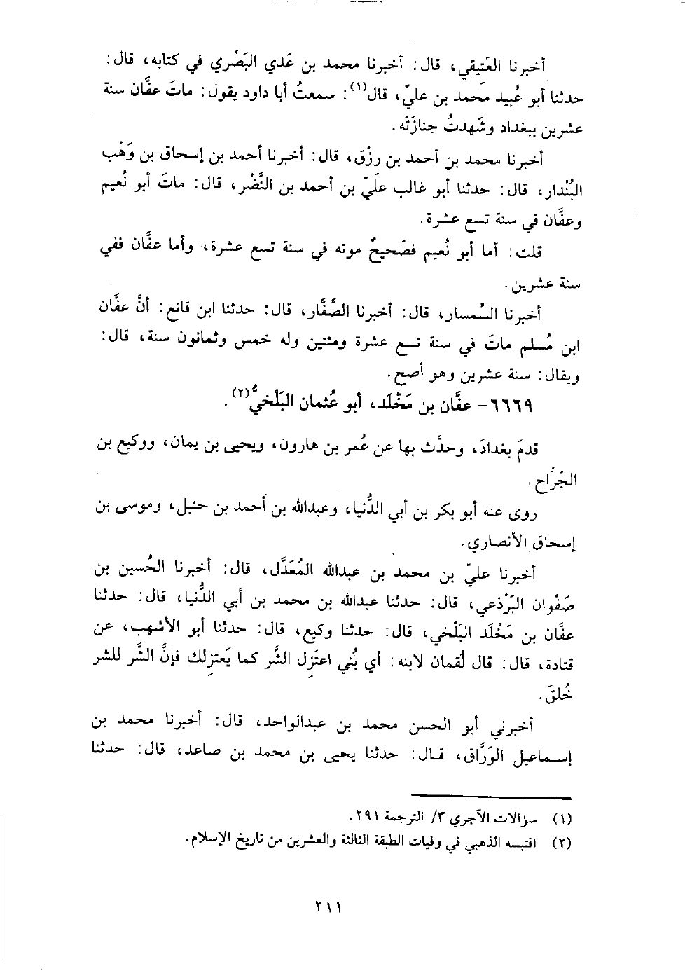 6669 - عفان بْن مخلد، أَبُو عثمان البلخي قدم بغداد، وحدث بها عَنْ عمر بْن هارون، ويحيى بْن يمان، ووكيع بْن الجراح.