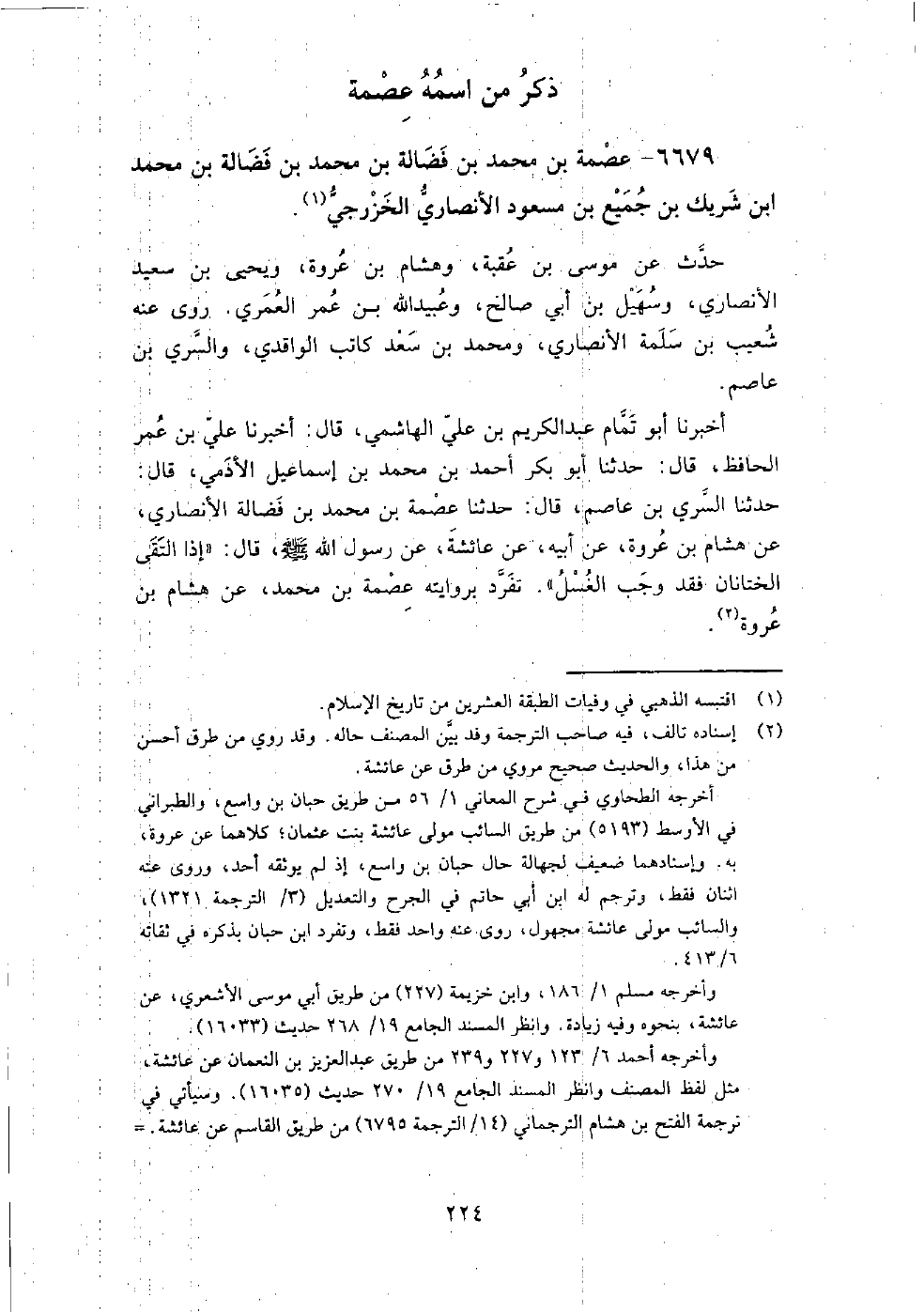 6679 - عصمة بْن مُحَمَّد بْن فضالة بْن مُحَمَّد بْن فضالة بْن مُحَمَّد بْن شريك بْن جميع بْن مسعود الأنصاري الخزرجي حدث عَنْ موسى بْن عقبة، وهشام بْن عروة، ويحيى بْن سعيد الأنصاري، وسهيل بْن أبي صالح، وعبيد اللَّه بْن عمر العمري.