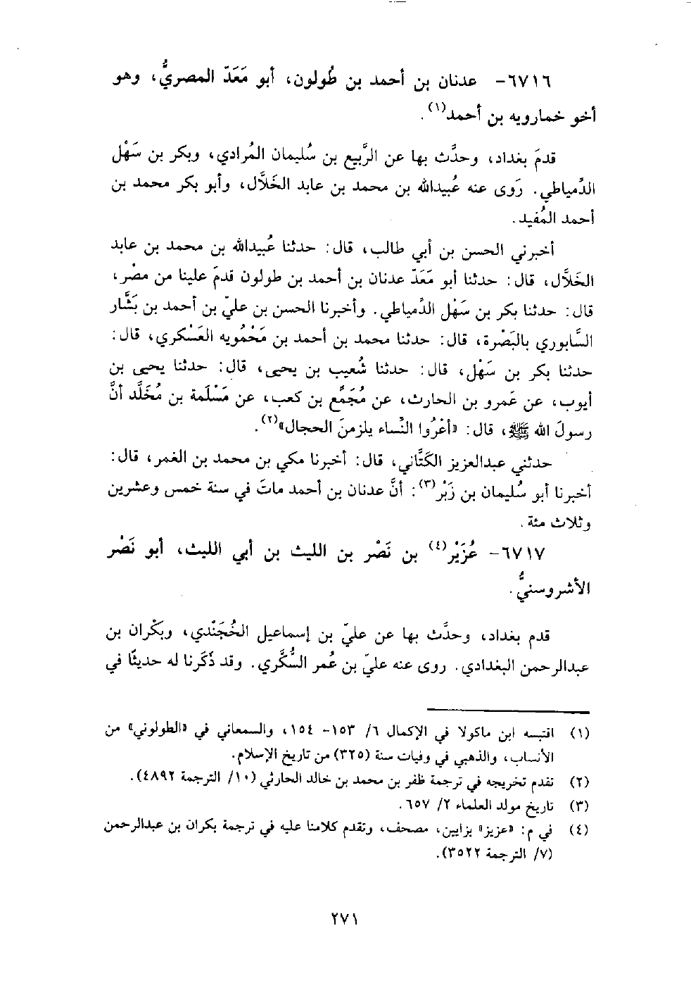 6716 - عدنان بْن أَحْمَد بْن طولون، أَبُو معد المصري، وهو أخو خمارويه بْن أَحْمَد قدم بغداد، وحدث بها عَنِ الربيع بْن سليمان المرادي، وبكر بْن سهل الدمياطي.