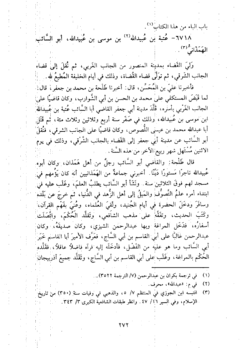 6718 - عتبة بْن عبيد اللَّه بْن موسى بْن عبيد اللَّه، أَبُو السائب الهمذاني ولي القضاء بمدينة المنصور، من الجانب الغربي، ثم نقل إلى قضاء الجانب الشرقي، ثم تولى قضاء القضاة، وذلك في أيام الخليفة المطيع لله.