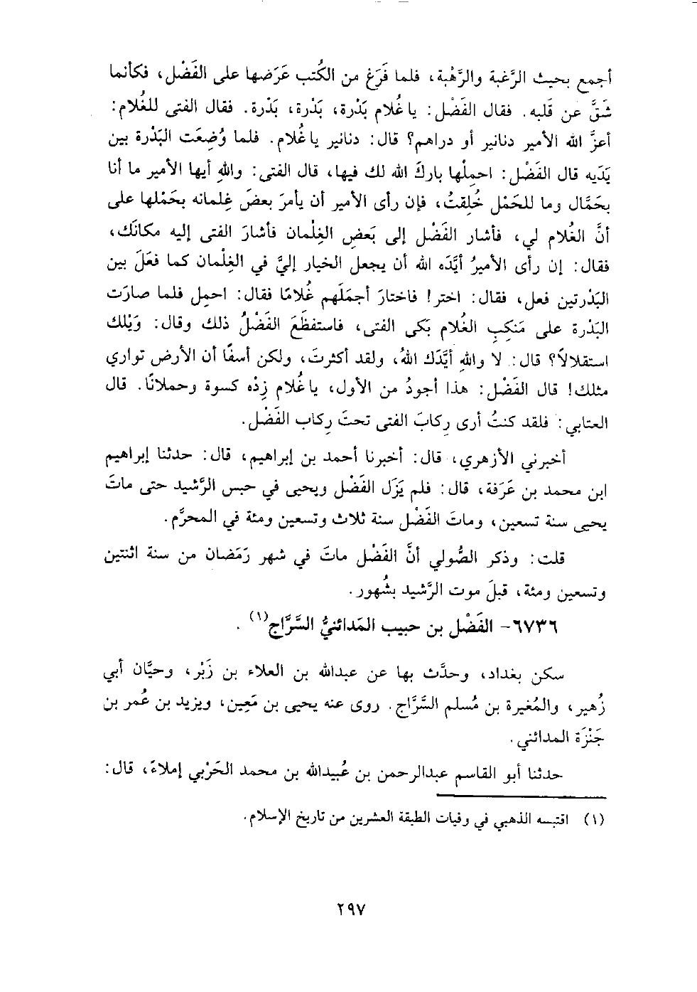 6736 - الفضل بْن حبيب المدائني السراج سكن بغداد، وحدث بها عَنْ عبد اللَّه بْن العلاء بْن زبر، وحيان أبي زهير، والمغيرة بن مسلم السراج.