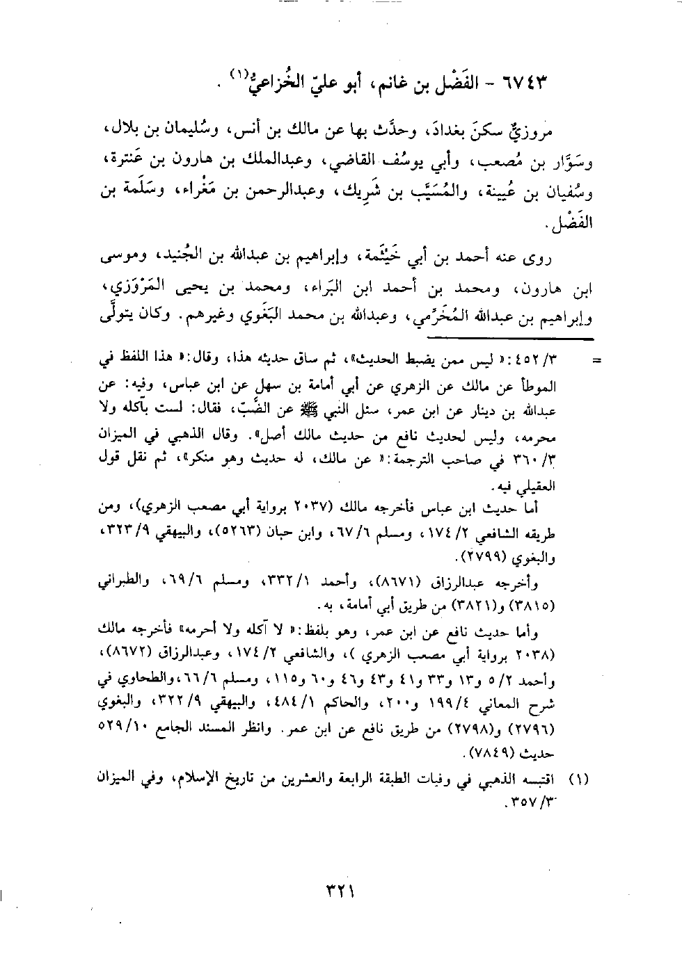 6743 - الفضل بْن غانم، أَبُو علي الخزاعي مروزي سكن بغداد، وحدث بها عَنْ مالك بْن أنس، وسليمان بْن بلال، وسوار بْن مصعب، وأبي يوسف القاضي، وعبد الملك بْن هارون بْن عنترة، وسفيان بْن عيينة، والمسيب بْن شريك، وعبد الرحمن بْن مغراء، وسلمة بْن الفضل.
