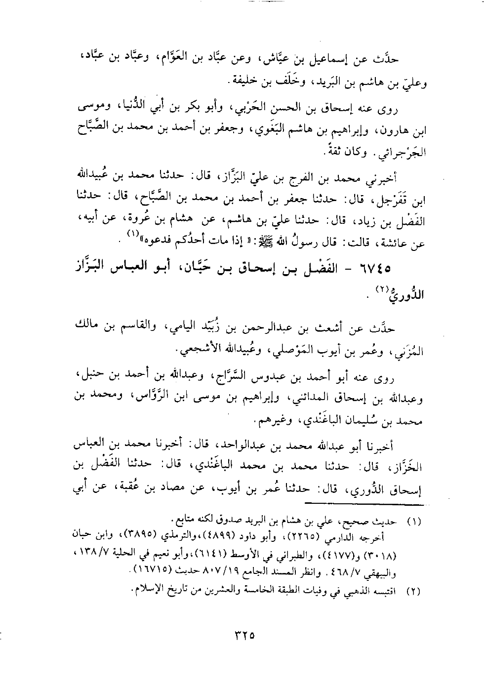 6745 - الفضل بْن إسحاق بْن حيان، أَبُو العباس البزاز الدوري حدث عَنْ أشعث بْن عبد الرحمن بْن زبيد اليامي، والقاسم بْن مالك المزني، وعمر بْن أيوب الموصلي، وعبيد اللَّه الأشجعي.