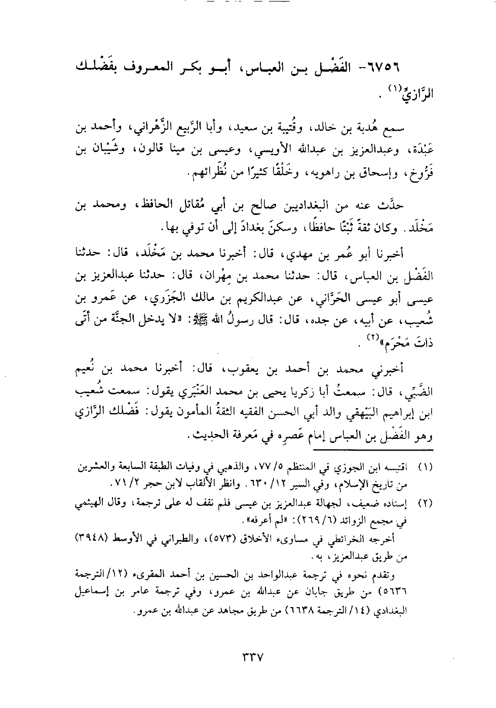 (4223) -[14: 337] أَخْبَرَنَا أَبُو عُمَرَ بْنُ مَهْدِيٍّ، قَالَ: أَخْبَرَنَا مُحَمَّدُ بْنُ مَخْلَدٍ، قَالَ: حَدَّثَنَا الْفَضْلُ بْنُ الْعَبَّاسِ، قَالَ: حَدَّثَنَا مُحَمَّدُ بْنُ مِهْرَانَ، قَالَ: حَدَّثَنَا عَبْدُ الْعَزِيزِ بْنُ عِيسَى أَبُو عِيسَى الْحَرَّانِيُّ، عَنْ عَبْدِ الْكَرِيمِ بْنِ مَالِكٍ الْجَزْرِيِّ، عَنْ عَمْرِو بْنِ شُعَيْبٍ، عَنْ أَبِيهِ، عَنْ جَدِّهِ، قَالَ: قَالَ رَسُولُ اللَّهِ صَلَّى اللَّهُ عَلَيْهِ وَسَلَّمَ: " لا يَدْخُلُ الْجَنَّةُ مَنْ أَتَى ذَاتَ مَحْرَمٍ " أَخْبَرَنِي مُحَمَّد بْن أَحْمَد بْن يعقوب، قَالَ: أَخْبَرَنَا مُحَمَّد بْن نعيم الضبي، قَالَ: سمعت أبا زكريا يحيى بْن مُحَمَّد العنبري يقول: سمعت شعيب بْن إبراهيم البيهقي، والد أبي الحسن الفقيه الثقة المأمون، يقول: فضلك الرازي، وهو الفضل بْن العباس إمام عصره في معرفة الحديث.