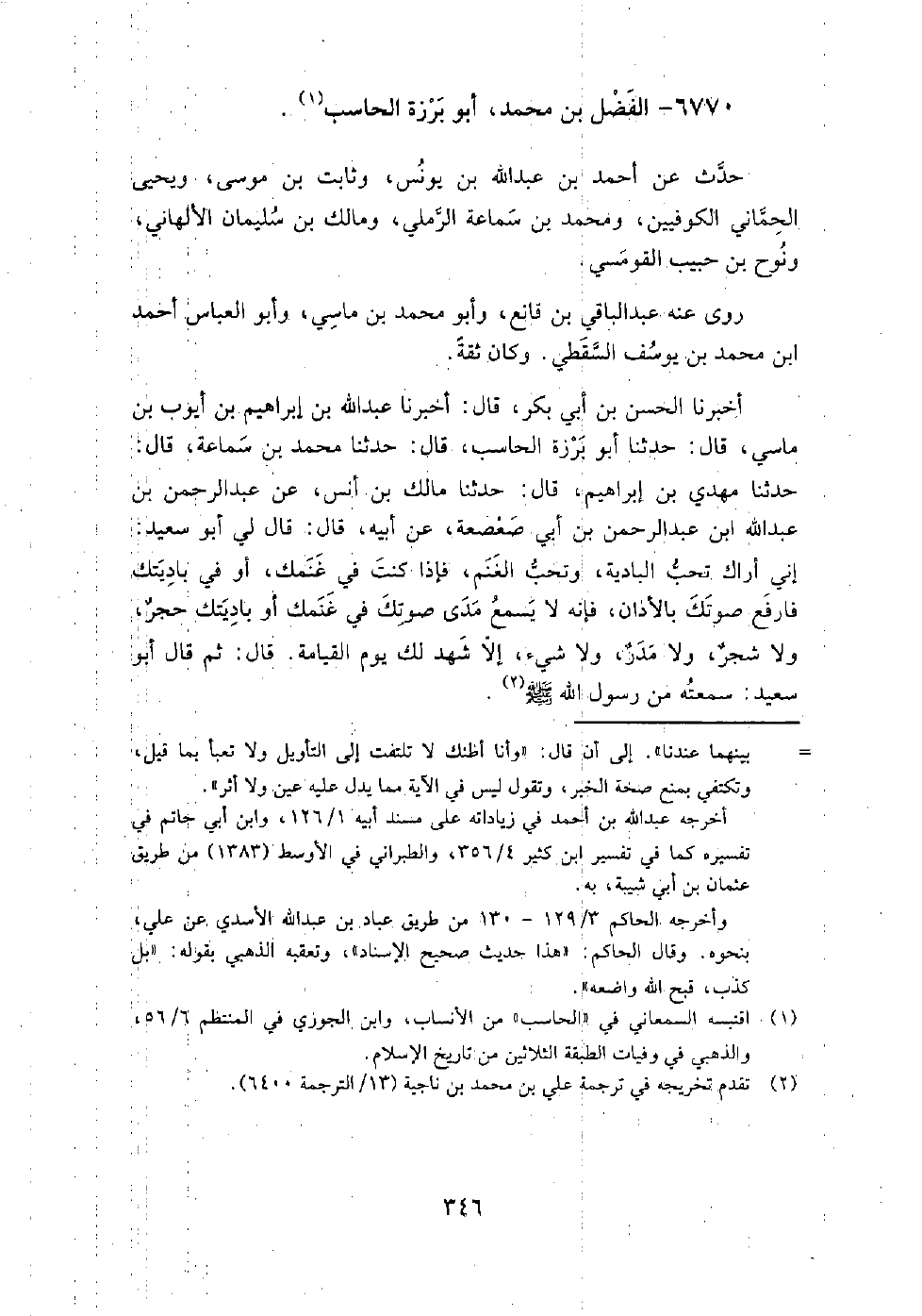 6770 - الفضل بْن مُحَمَّد، أَبُو برزة الحاسب حدث عَنْ أَحْمَد بْن عَبْدِ اللَّه بْن يونس، وثابت بْن موسى، ويحيى الحماني الكوفيين، ومحمد بْن سماعة الرملي، ومالك بْن سليمان الألهاني، ونوح بْن حبيب القومسي.