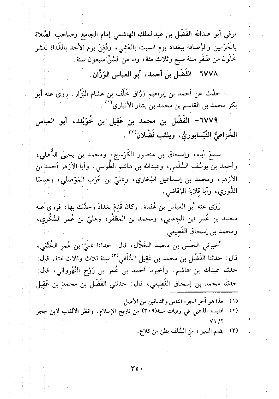 6778 - الفضل بْن أَحْمَد، أَبُو العباس الوزان حدث عَنْ أَحْمَد بْن إبراهيم، وراق خلف بْن هشام البزار.