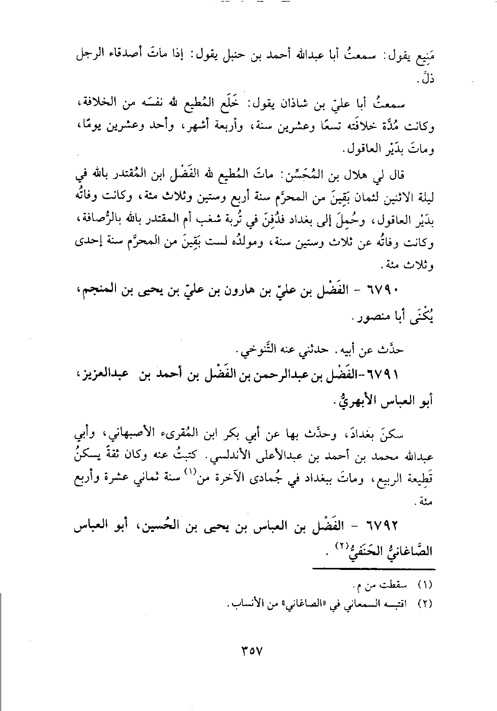 6792 - الفضل بْن العباس بْن يحيى بْن الحسين، أَبُو العباس الصاغاني الحنفي قدم علينا حاجا بعد سنة عشرين وأربع مائة، وحدث ببغداد، عَنْ مُحَمَّد بْن مُحَمَّد بْن عبدوس الحيري، ومحمد بْن الحسين بْن داود العلوي، وعبد الرحمن بْن إبراهيم بْن مُحَمَّد بْن يحيى المزكي، ومحمد بْن مُحَمَّد بْن حامد القطان، والحسين بْن مُحَمَّد بْن علي السيوري النيسابوريين.