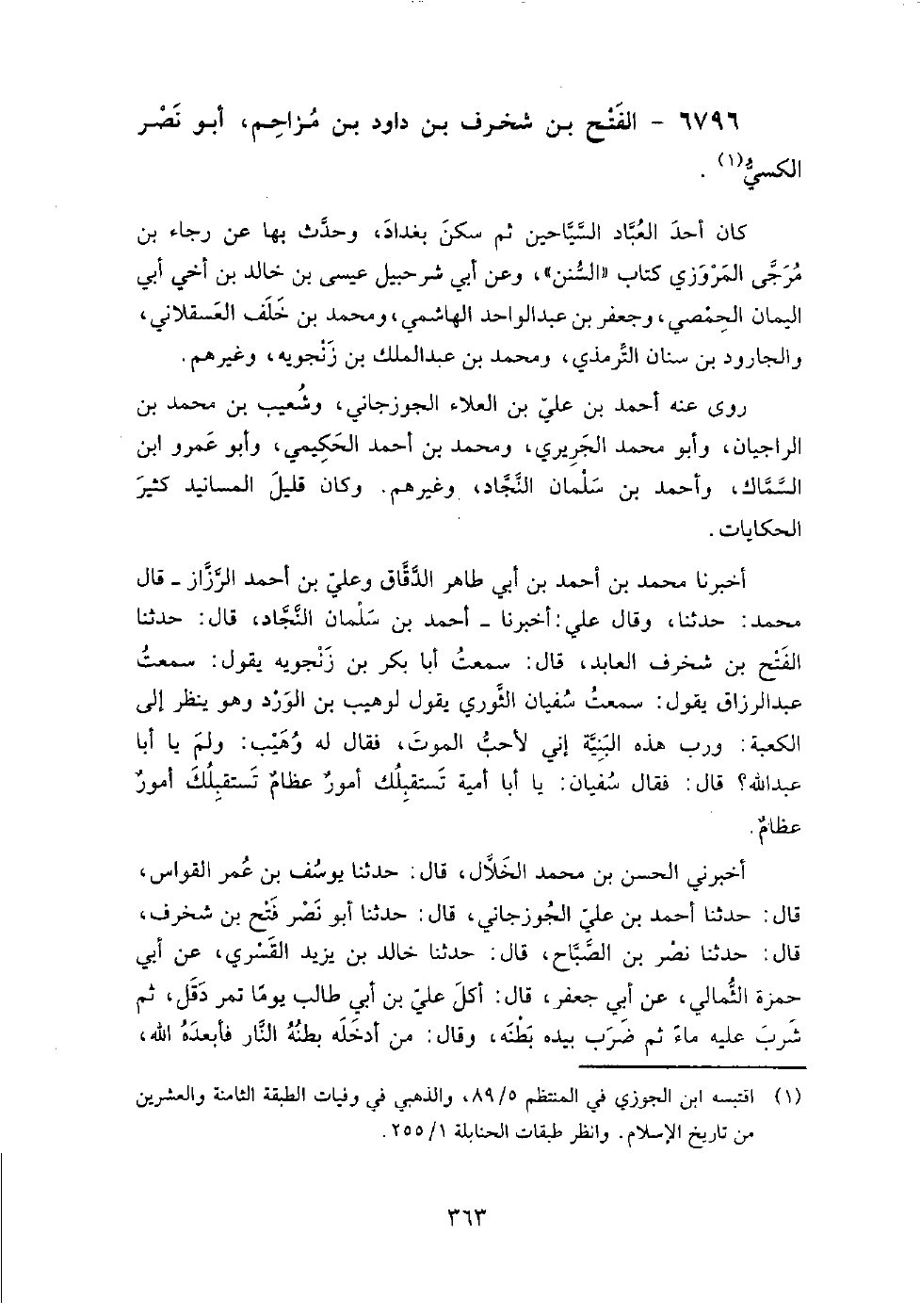 6796 - الفتح بْن شخرف بْن داود بْن مزاحم، أَبُو نصر الكسيّ كان أحد العباد السياحين، ثم سكن بغداد، وحدث بها عَنْ رجاء بْن مرجى المروزي، في كتاب السنن، وعن أبي شرحبيل عيسى بْن خالد بْن أخي بْن اليمان الحمصي، وجعفر بْن عبد الواحد الهاشمي، ومحمد بْن خلف العسقلاني، والجارود بْن سنان الترمذي، ومحمد بْن عبد الملك بْن زنجويه، وغيرهم.