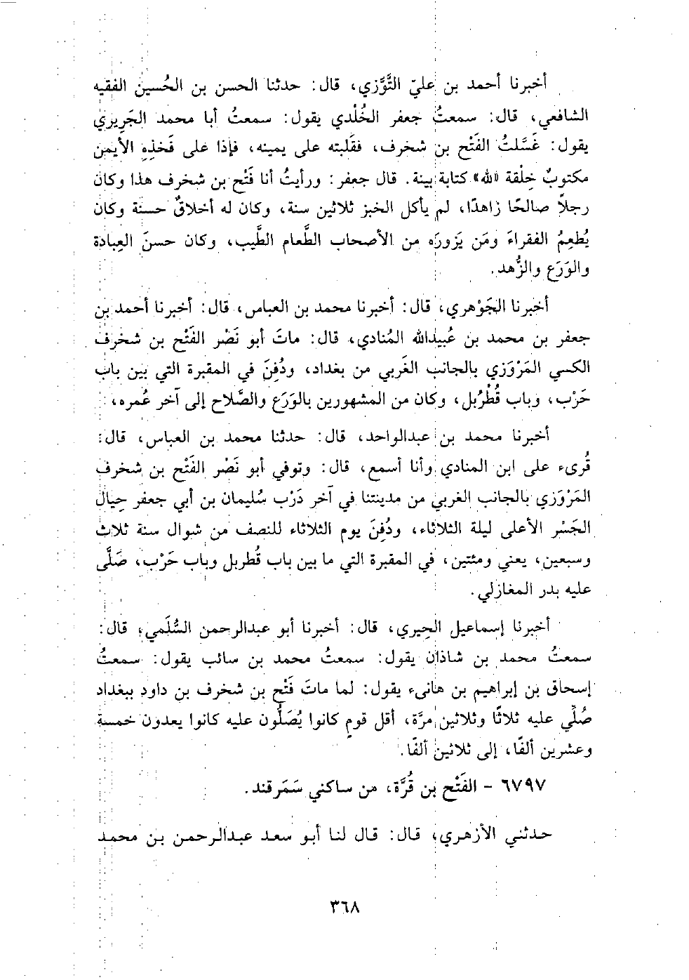 6797 - الفتح بْن قرة، من ساكني سمرقند حَدَّثَنِي الأزهري، قَالَ: قَالَ لنا أَبُو سعد عبد الرحمن بْن مُحَمَّد الإدريسي: الفتح بْن قرة يقال: إنه سمرقندي، وعندي أن أصله من بغداد، سكن سمرقند فنسب إليها، كتب الكثير، وجمع وحفظ.