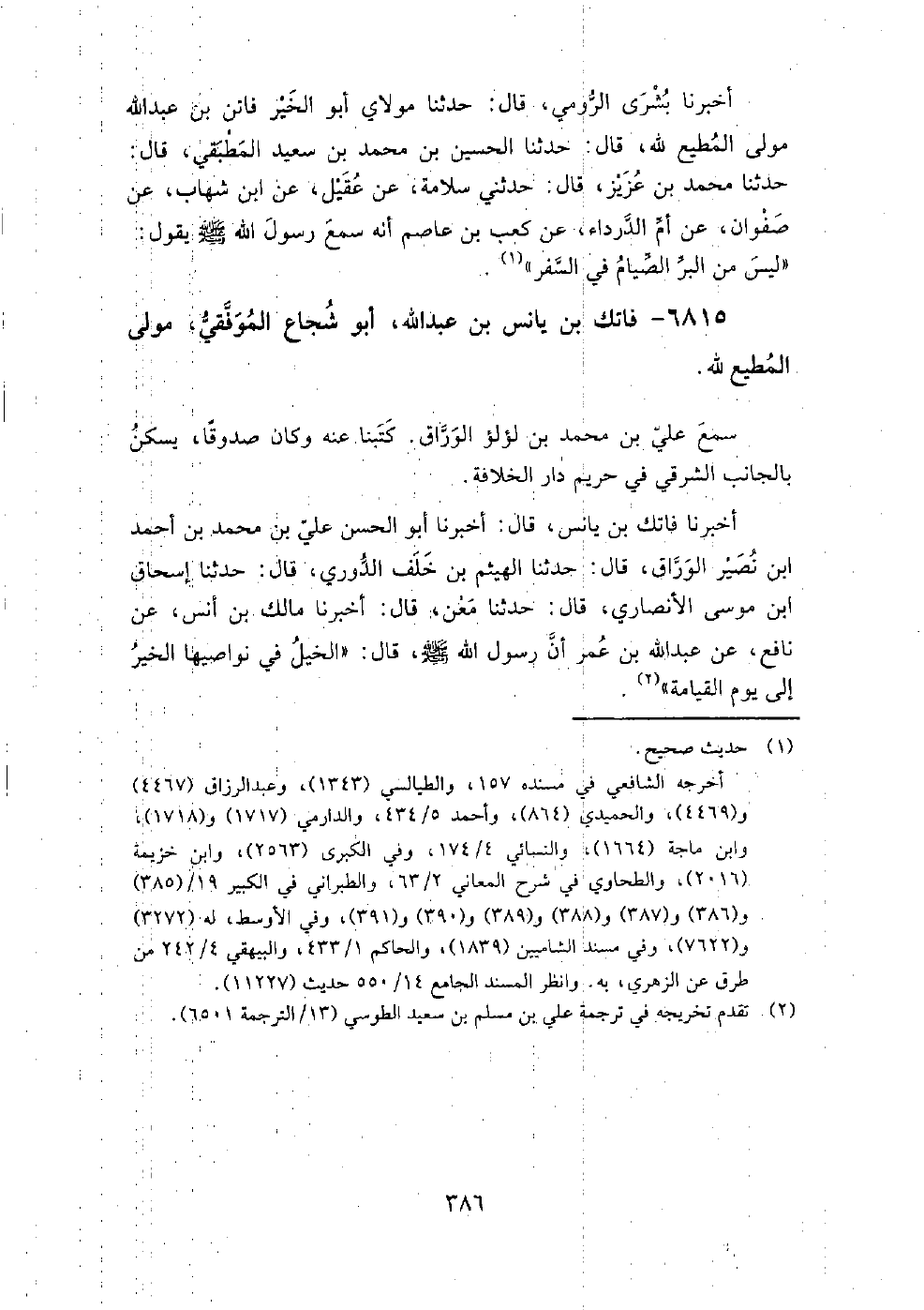 (4259) -[14: 386] أَخْبَرَنَا فَاتِكُ بْنُ يَانِسٍ، قَالَ: أَخْبَرَنَا أَبُو الْحَسَنِ عَلِيُّ بْنُ مُحَمَّدِ بْنِ أَحْمَدَ بْنِ نُصَيْرٍ الْوَرَّاقُ، قَالَ: حَدَّثَنَا الْهَيْثَمُ بْنُ خَلَفٍ الدُّورِيُّ، قَالَ: حَدَّثَنَا إِسْحَاقُ بْنُ مُوسَى الأَنْصَارِيُّ، قَالَ: حَدَّثَنَا مَعْنٌ، قَالَ: أَخْبَرَنَا مَالِكُ بْنُ أَنَسٍ، عَنْ نَافِعٍ، عَنْ عَبْدِ اللَّهِ بْنِ عُمَرَ، أَنَّ رَسُولَ اللَّهِ صَلَّى اللَّهُ عَلَيْهِ وَسَلَّمَ قَالَ: " الْخَيْلُ فِي نَوَاصِيهَا الْخَيْرُ إِلَى يَوْمِ الْقِيَامَةِ "