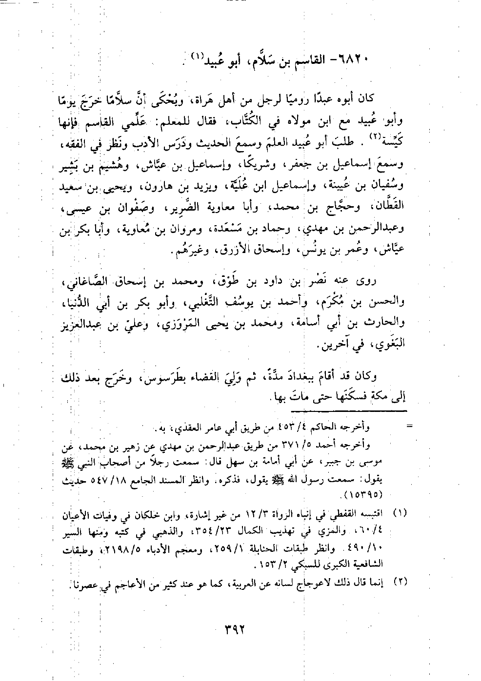 6820 - القاسم بْن سلام، أَبُو عبيد كان أبوه عبدا روميا لرجل من أهل هراة، ويحكى أن سلاما خرج يوما، وأبو عبيد مع ابْن مولاه في الكتاب، فقال للمعلم: علمي القاسم، فإنها كيسة.
