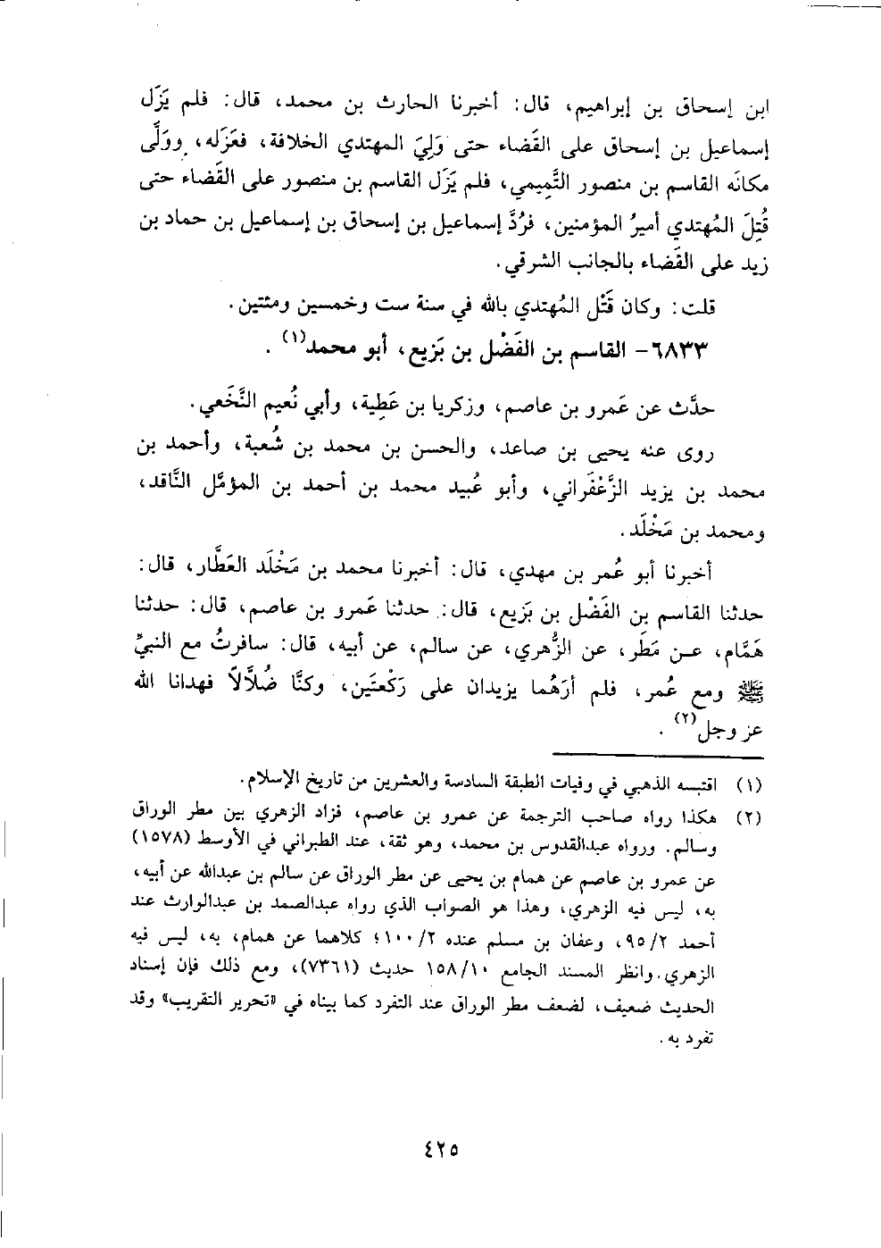 (4270) -[14: 425] أَخْبَرَنَا أَبُو عُمَرَ بْنُ مَهْدِيٍّ، قَالَ: أَخْبَرَنَا مُحَمَّدُ بْنُ مَخْلَدٍ الْعَطَّارُ، قَالَ: حَدَّثَنَا الْقَاسِمُ بْنُ الْفَضْلِ بْنِ بُزَيْعٍ، قَالَ: حَدَّثَنَا عَمْرُو بْنُ عَاصِمٍ، قَالَ: حَدَّثَنَا هَمَّامٌ، عَنْ مَطَرٍ، عَنِ الزُّهْرِيِّ، عَنْ سَالِمٍ، عَنْ أَبِيهِ، قَالَ: " سَافَرْتُ مَعَ النَّبِيِّ صَلَّى اللَّهُ عَلَيْهِ وَسَلَّمَ وَمَعَ عُمَرَ، فَلَمْ أَرَهُمَا يَزِيدَانِ عَلَى رَكْعَتَيْنِ، وَكُنَّا ضُلالا فَهَدَانَا اللَّهُ عَزَّ وَجَلَّ " أَخْبَرَنِي الأزهري، قَالَ: أَخْبَرَنَا المعافى بْن زكريا الجريري، قَالَ: حَدَّثَنَا مُحَمَّد بْن مخلد، قَالَ: حَدَّثَنَا القاسم بْن بزيع، وكان ثقة.