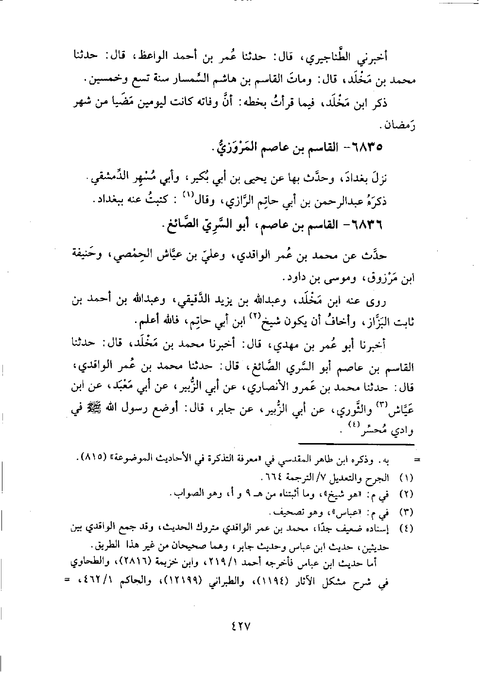 6835 - القاسم بْن عصام المروزي نزل بغداد، وحدث بها عَنْ يحيى بْن أبي بكير، وأبي مسهر الدمشقي، ذكره عبد الرحمن بْن أبي حاتم الرازي وَقَالَ: كتبت عنه ببغداد.