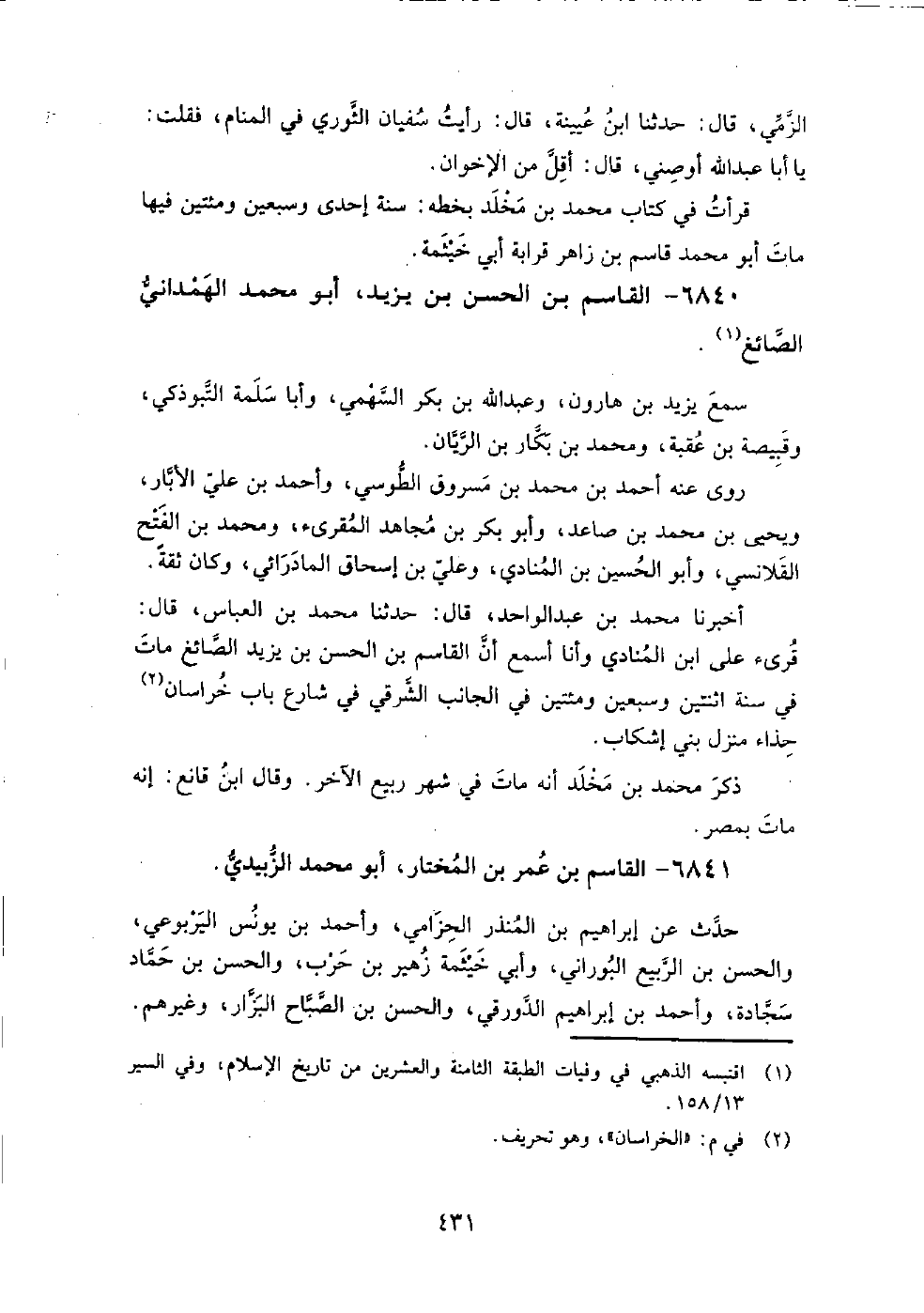 6840 - القاسم بْن الحسن بْن يزيد، أَبُو مُحَمَّد الهمداني الصائغ سمع يزيد بْن هارون، وعبد اللَّه بْن بكر السهمي، وأبا سلمة التبوذكي، وقبيصة بن عقبة، ومحمد بن بكار بن الريان.