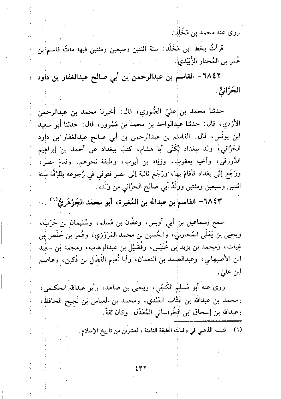 حَدَّثَنَا مُحَمَّد بْن علي الصوري، قَالَ: أَخْبَرَنَا مُحَمَّد بْن عبد الرحمن الأزدي، قَالَ: حَدَّثَنَا عبد الواحد بْن مُحَمَّد بْن مسرور، قَالَ: حَدَّثَنَا أَبُو سعيد بْن يونس، قَالَ: القاسم بْن عبد الرحمن بْن أبي صالح عبد الغفار داود الحراني، ولد ببغداد، يكنى أبا هشام كتب ببغداد، عَنْ أَحْمَد بْن إبراهيم الدورقي، وأخيه يعقوب، وزياد بْن أيوب، وطبقة نحوهم.