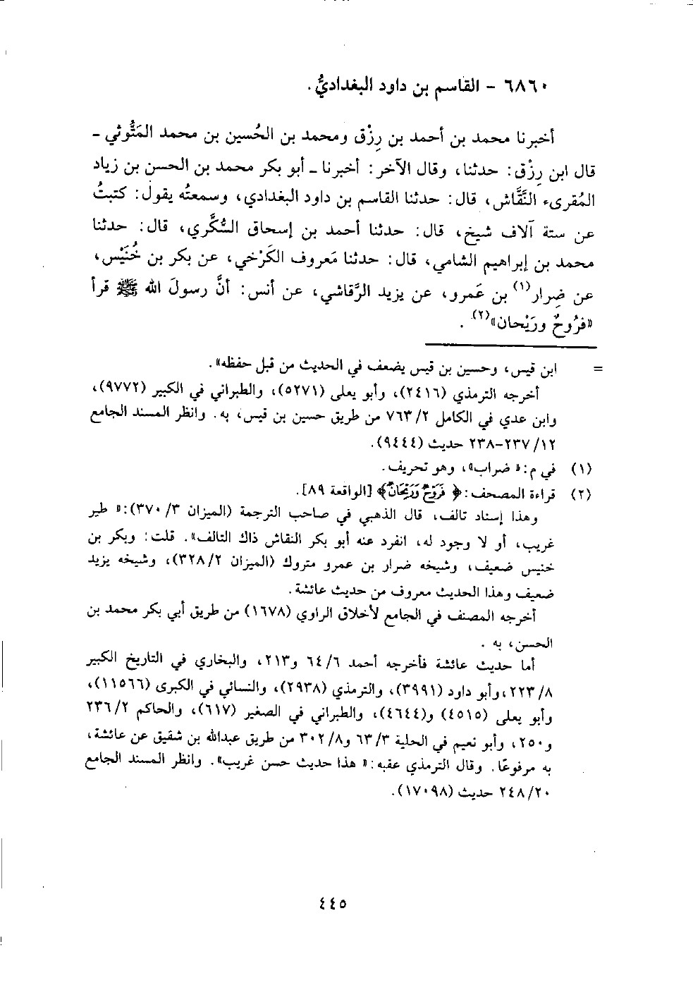 (4289) -[14: 445] أَخْبَرَنَا مُحَمَّدُ بْنُ أَحْمَدَ بْنِ رِزْقٍ وَمُحَمَّدُ بْنُ الْحُسَيْنِ بْنِ مُحَمَّدٍ الْمَتُّوثِيُّ، قَالَ ابْنُ: حَدَّثَنَا، وَقَالَ الآخَرُ: أَخْبَرَنَا أَبُو بَكْرٍ مُحَمَّدُ بْنُ الْحَسَنِ بْنِ زِيَادٍ الْمُقْرِئُ النَّقَّاشُ، قَالَ: حَدَّثَنَا الْقَاسِمُ بْنُ دَاوُدَ الْبَغْدَادِيُّ، وَسَمِعْتُهُ يَقُولُ: كَتَبْتُ عَنْ سِتَّةِ آلافِ شَيْخٍ، قَالَ: حَدَّثَنَا أَحْمَدُ بْنُ إِسْحَاقَ السُّكَّرِيُّ، قَالَ: حَدَّثَنَا مُحَمَّدُ بْنُ إِبْرَاهِيمَ الشَّامِيُّ، قَالَ: حَدَّثَنَا مَعْرُوفُ الْكَرْخِيِّ، عَنْ بَكْرِ بْنِ خُنَيْسٍ، عَنْ ضَرَّارِ بْنِ عَمْرٍو، عَنْ يَزِيدَ الرَّقَاشِيِّ، عَنْ أَنَسٍ، أَنَّ رَسُولَ اللَّهِ صَلَّى اللَّهُ عَلَيْهِ وَسَلَّمَ " قَرَأ َ {فَرَوْحٌ وَرَيْحَانٌ}