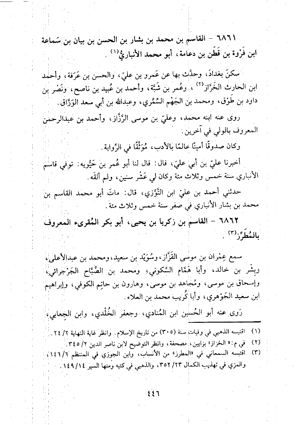 6861 - القاسم بْن مُحَمَّد بْن بشار بْن الحسن بْن بيان بْن سماعة بْن فروة بْن قطن بْن دعامة، أَبُو مُحَمَّد الأنباري