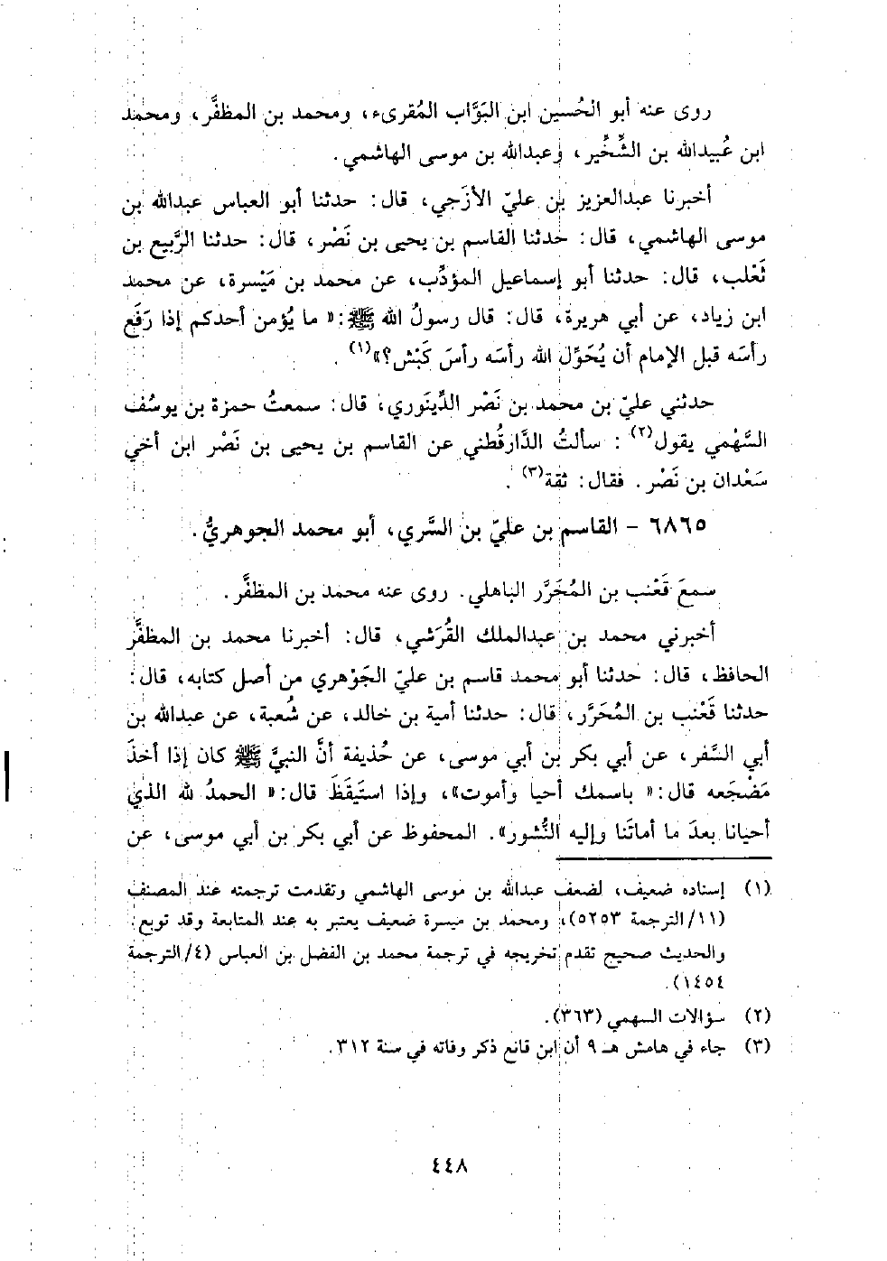 (4291) -[14: 448] أَخْبَرَنِي مُحَمَّدُ بْنُ عَبْدِ الْمَلِكِ الْقُرَشِيُّ، قَالَ: أَخْبَرَنَا مُحَمَّدُ بْنُ الْمُظَفَّرِ الْحَافِظُ، قَالَ: حَدَّثَنَا أَبُو مُحَمَّدٍ قَاسِمُ بْنُ عَلِيٍّ الْجَوْهَرِيُّ مِنْ أَصْلِ كِتَابِهِ، قَالَ: حَدَّثَنَا قَعْنَبُ بْنُ الْمُحَرَّرِ، قَالَ: حَدَّثَنَا أُمَيَّةُ بْنُ خَالِدٍ، عَنْ شُعْبَةَ، عَنْ عَبْدِ اللَّهِ بْنِ أَبِي السَّفَرِ، عَنْ أَبِي بَكْرِ بْنِ أَبِي مُوسَى، عَنْ حُذَيْفَةَ أَنَّ النَّبِيَّ صَلَّى اللَّهُ عَلَيْهِ وَسَلَّمَ كَانَ إِذَا أَخَذَ مَضْجَعَهُ، قَالَ: " بِاسْمِكَ أَحْيَا وَأَمُوتُ، وَإِذَا اسْتَيْقَظَ، قَالَ: الْحَمْدُ لِلَّهِ الَّذِي أَحْيَانَا بَعْدَ مَا أَمَاتَنَا وَإِلَيْهِ النُّشُورُ " المحفوظ عَنْ أبي بكر بْن أبي موسى، عَنِ البراء، عَنِ النَّبِيّ صَلَّى اللَّهُ عَلَيْهِ وَسَلَّمَ حَدَّثَنِي علي بْن مُحَمَّد بْن نصر، قَالَ: سمعت حمزة السهمي يقول: سألت الدارقطني، عَنِ القاسم بْن علي بْن أبي مُحَمَّد الجوهري، ببغداد، فقال: ثقة.