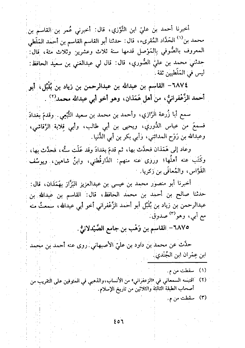 6874 - القاسم بْن عَبْدِ اللَّه بْن عَبْدِ الرحمن بْن زياد بْن بلبل، أَبُو أَحْمَد الزعفراني من أهل همذان، وهو أخو أبي عَبْد اللَّه مُحَمَّد.
