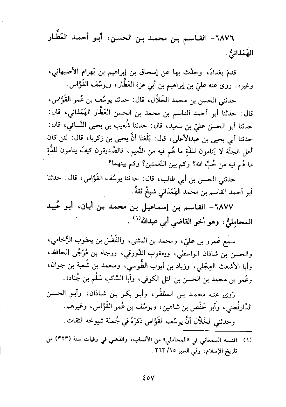 6876 - القاسم بْن مُحَمَّد بْن الحسن، أَبُو أَحْمَد العطار الهمذاني قدم بغداد، وحدث بها عَنْ إسحاق بْن إبراهيم بْن بهرام الأصبهاني، وغيره، روى عنه علي بْن إبراهيم بْن أبي عزة العطار، ويوسف القواس.