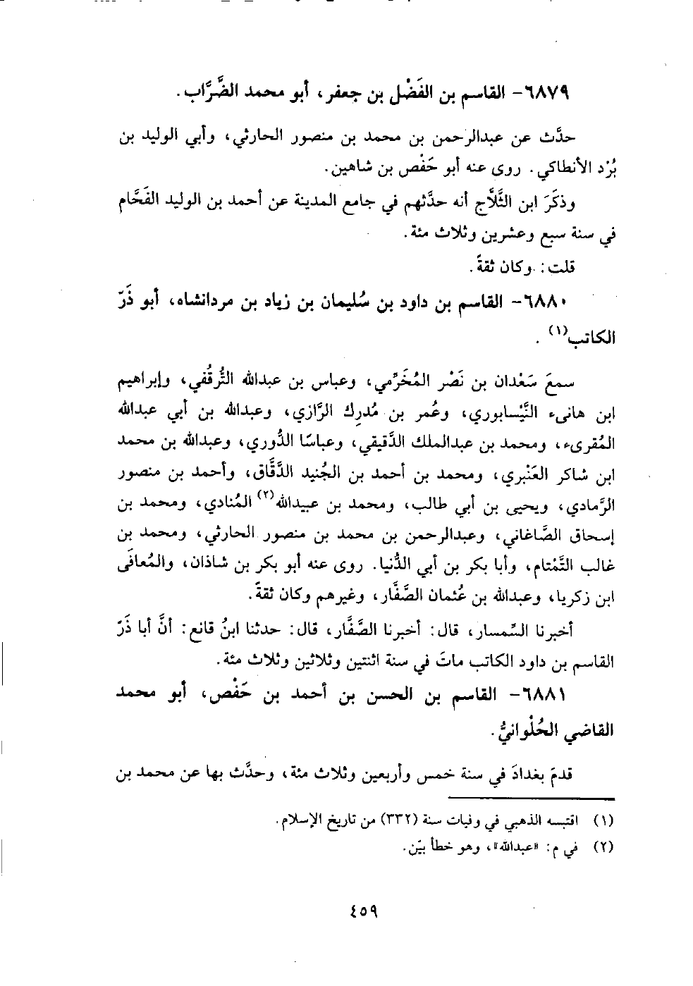 6879 - القاسم بْن الفضل بْن جعفر، أَبُو مُحَمَّد الضراب حدث عَنْ عَبْدِ الرحمن بْن مُحَمَّد بْن منصور الحارثي، وأبي الوليد بْن برد الأنطاكي، روى عنه أَبُو حفص بْن شاهين.
