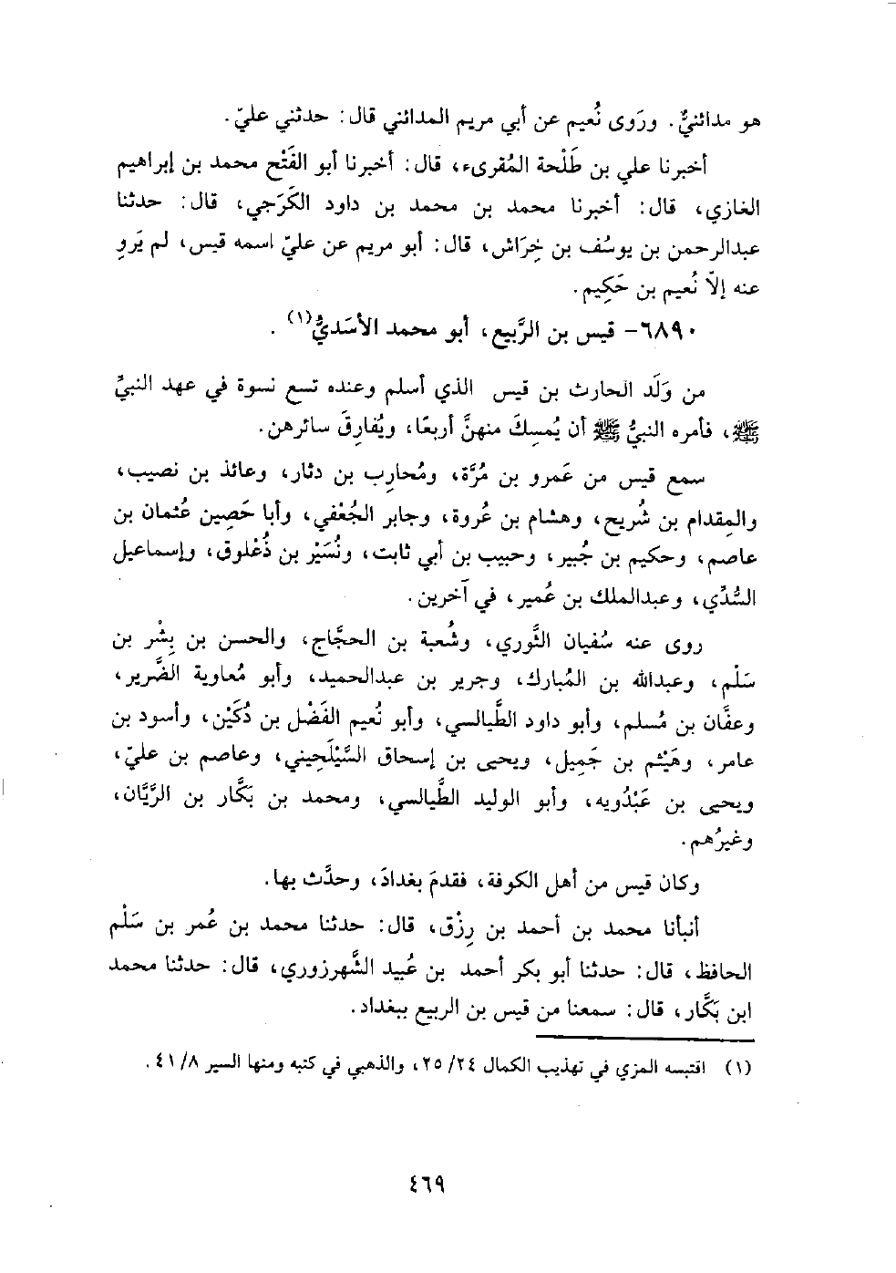 6890 - قيس بْن الربيع، أَبُو مُحَمَّد الأسدي من ولد الحارث بْن قيس الذي أسلم، وعنده تسع نسوة في عهد النَّبِيّ صَلَّى اللَّهُ عَلَيْهِ وَسَلَّمَ فأمره النَّبِيّ صَلَّى اللَّهُ عَلَيْهِ وَسَلَّمَ أن يمسك منهن أربعا، ويفارق سائرهن.