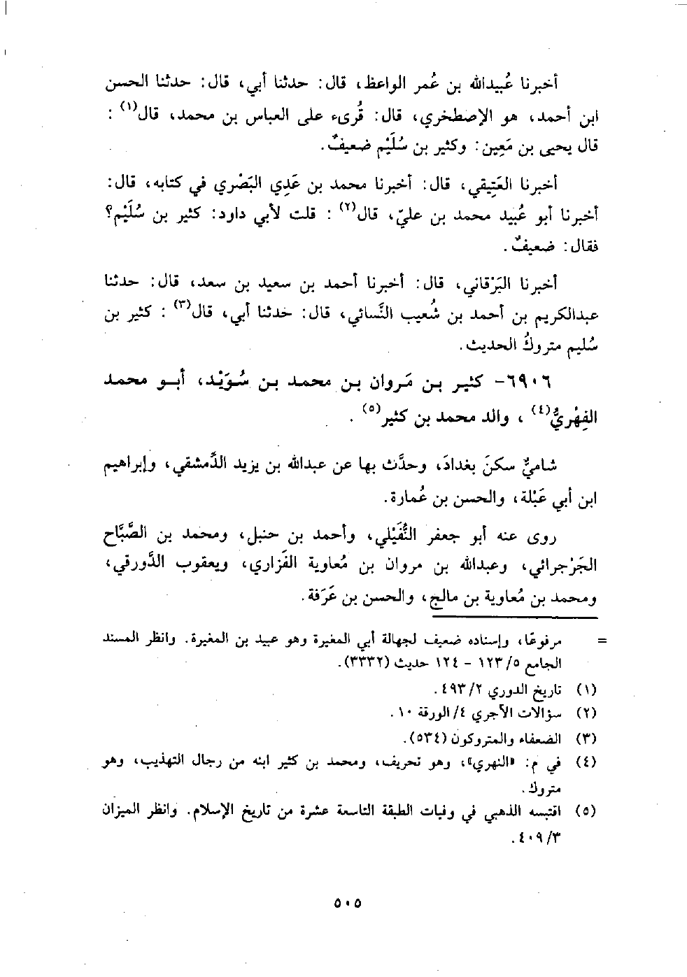 6906 - كثير بْن مروان بْن مُحَمَّد بْن سويد، أَبُو مُحَمَّد الفهري، والد مُحَمَّد بْن كثير شامي سكن بغداد، وحدث بها عَنْ عبد اللَّه بْن يزيد الدمشقي، وإبراهيم بْن أبي عبلة، والحسن بْن عمارة.