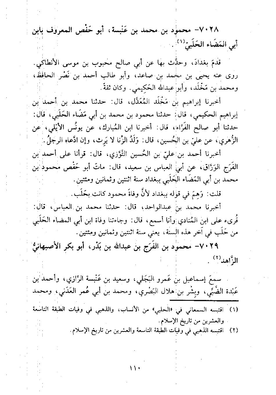 أَخْبَرَنَا إبراهيم بن مخلد المعدل، قَالَ: حَدَّثَنَا محمد بن أحمد بن إبراهيم الحكيمي، قَالَ: حَدَّثَنَا محمود بن محمد بن أبي مضاء الحلبي، قَالَ: حَدَّثَنَا أبو صالح الفراء، قَالَ: أَخْبَرَنَا ابْنُ المبارك، عن يونس الأيلي، عن الزهري، عن علي بن الحسين، قَالَ: ولد الزنا لا يرث، وإن ادعاه الرجل أَخْبَرَنَا أحمد بن علي بن الحسين التوزي، قَالَ: قرأنا على أحمد بن الفرج الوراق، عن أبي العباس بن سعيد، قَالَ: مات أبو حفص محمود بن محمد بن أبي المضاء الحلبي ببغداد سنة اثنتين وثمانين ومائتين قلت: وهم في قوله ببغداد، لأن وفاة محمود كانت بحلب.