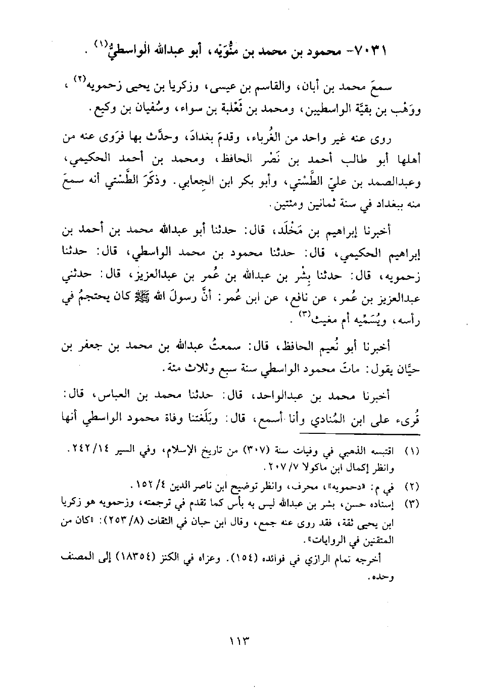 7031 - محمود بن محمد بن منويه أبو عبد الله الواسطي سمع: محمد بن أبان، والقاسم بن عيسى، وزكريا بن يحيى زحمويه، ووهب بن بقية الواسطيين، ومحمد بن ثعلبة بن سواء، وسفيان بن وكيع.