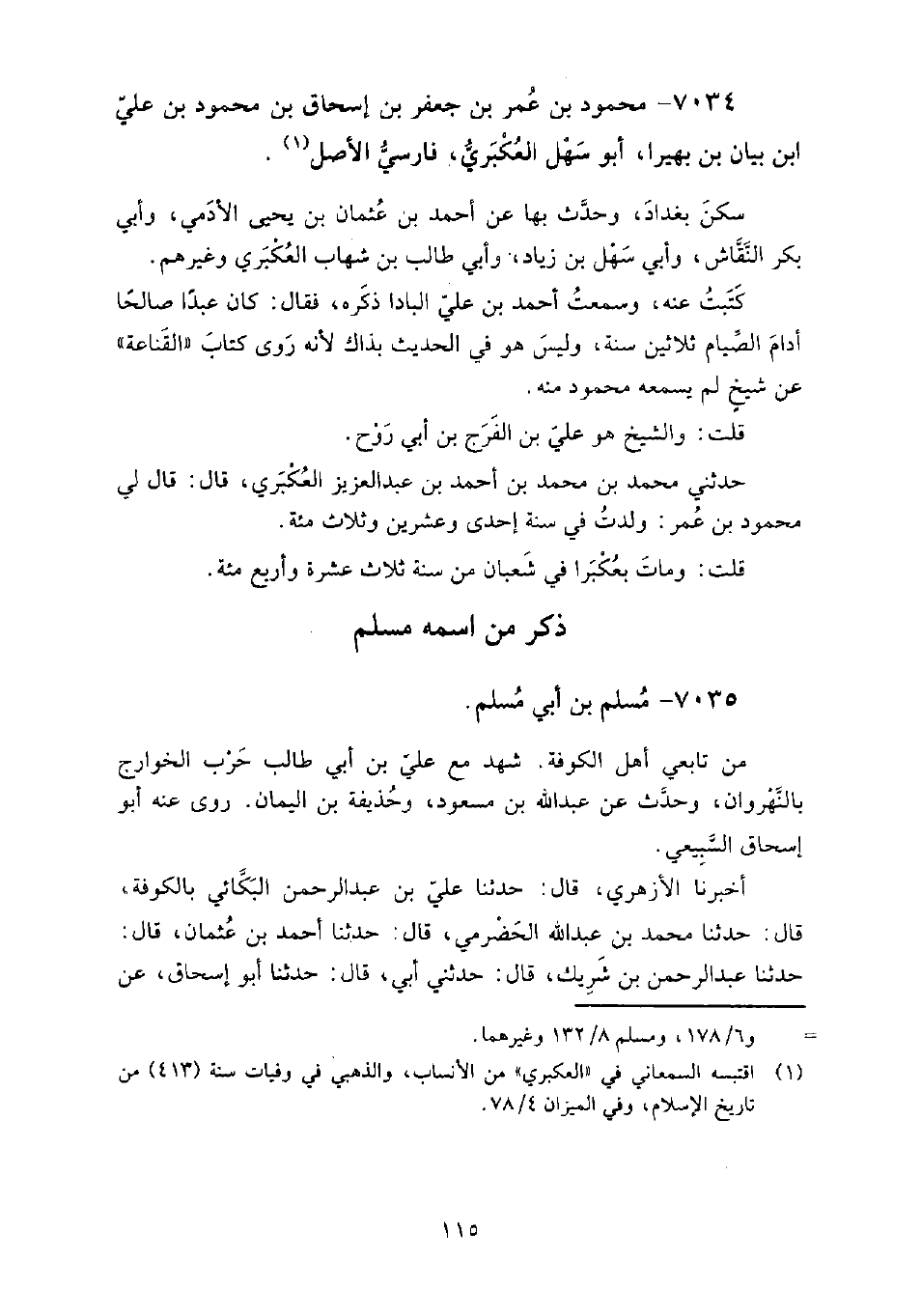 7034 - محمود بن عمر بن جعفر بن إسحاق بن محمود بن علي بن بيان بن بهيرا أبو سهل العكبري فارسي الأصل سكن بغداد، وحدث بها عن: أحمد بن عثمان بن يحيى الأدمي، وأبي بكر النقاش، وأبي سهل بن زياد، وأبي طالب بن شهاب العكبري، وغيرهم.