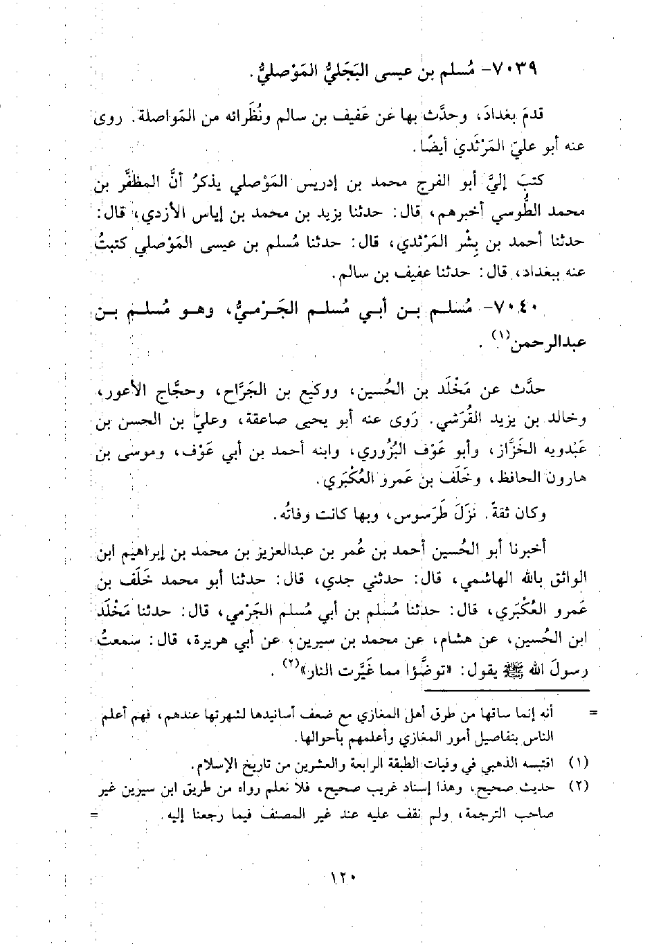 7039 - مسلم بن عيسى البجلي الموصلي قدم بغداد، وحدث بها عن: عفيف بن سالم، ونظرائه من المواصلة.
