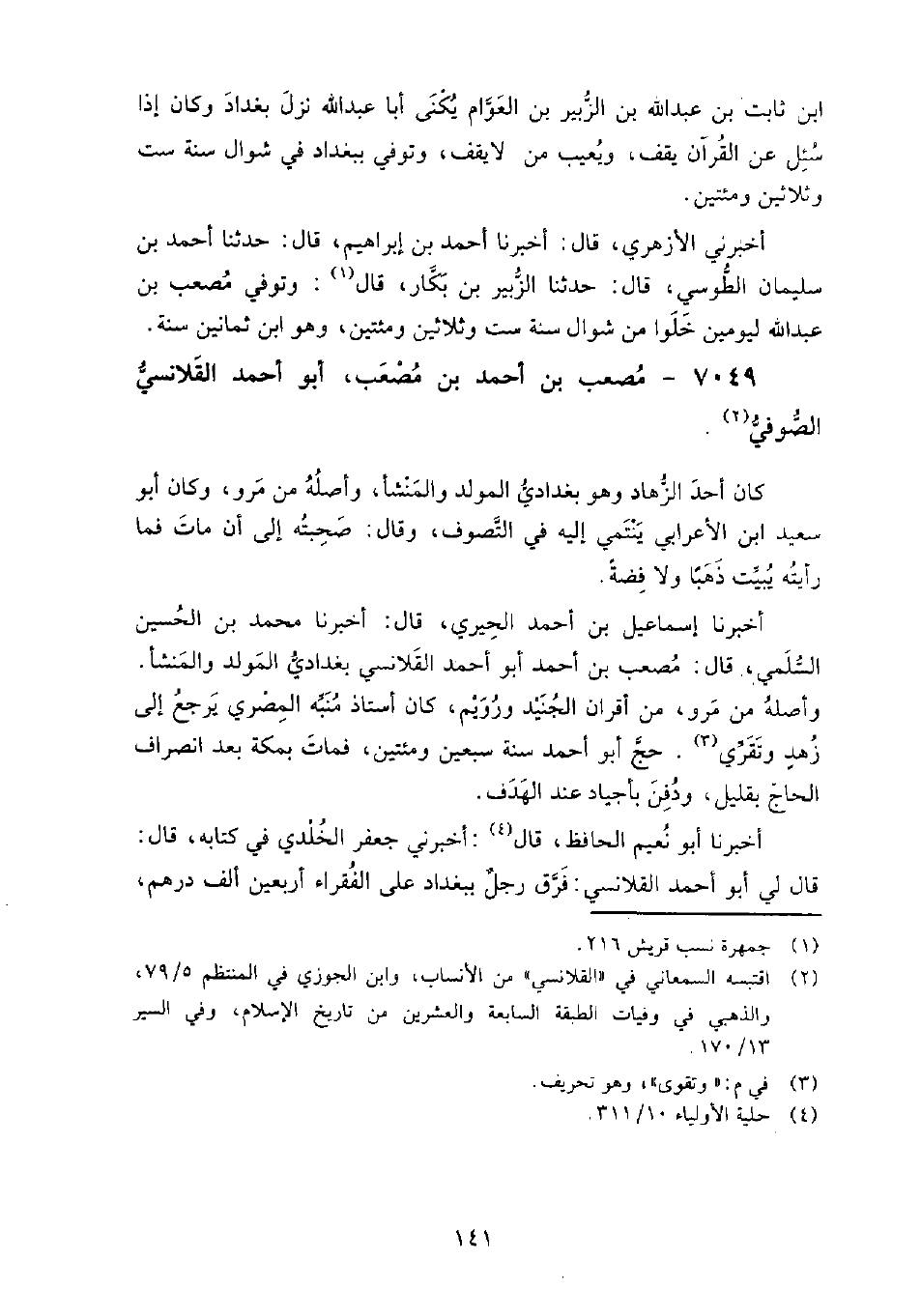 7049 - مصعب بن أحمد بن مصعب أبو أحمد القلانسي الصوفي كان أحد الزهاد، وهو بغدادي المولد والمنشأ، وأصله من مرو، وكان أبو سعيد ابن الأعرابي ينتمى إليه في التصوف، وَقَالَ: صحبته إلى أن مات، فما رأيته يبيت ذهبا ولا فضة.