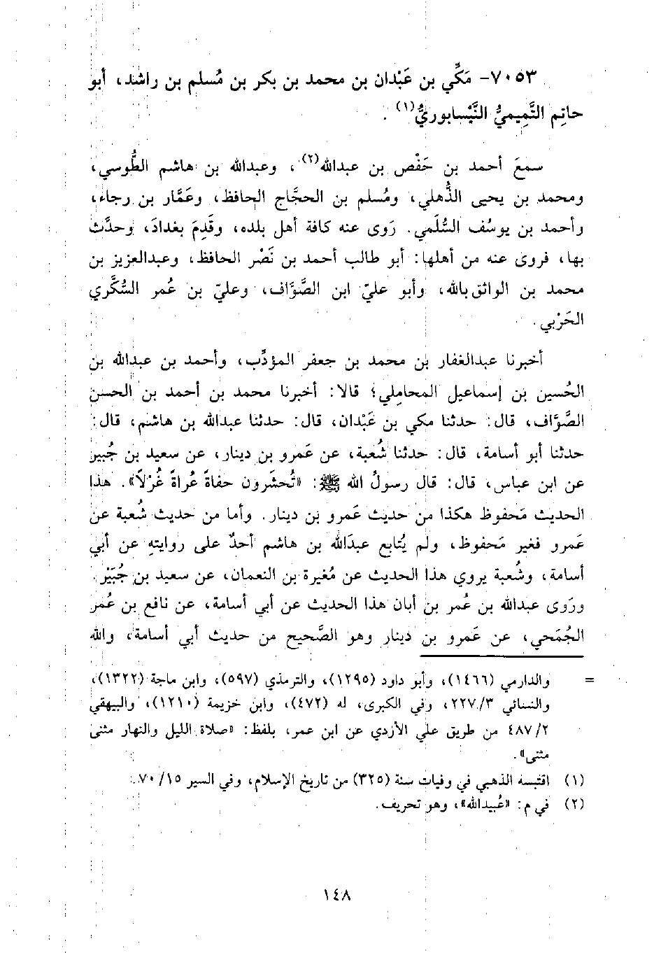 7053 - مكي بن عبدان بن محمد بن بكر بن مسلم بن راشد أبو حاتم التميمي النيسابوري سمع: أحمد بن حفص بن عبد الله، وعبد الله بن هاشم الطوسي، ومحمد بن يحيى الذهلي، ومسلم بن الحجاج الحافظ، وعمار بن رجاء، وأحمد بن يوسف السلمي.