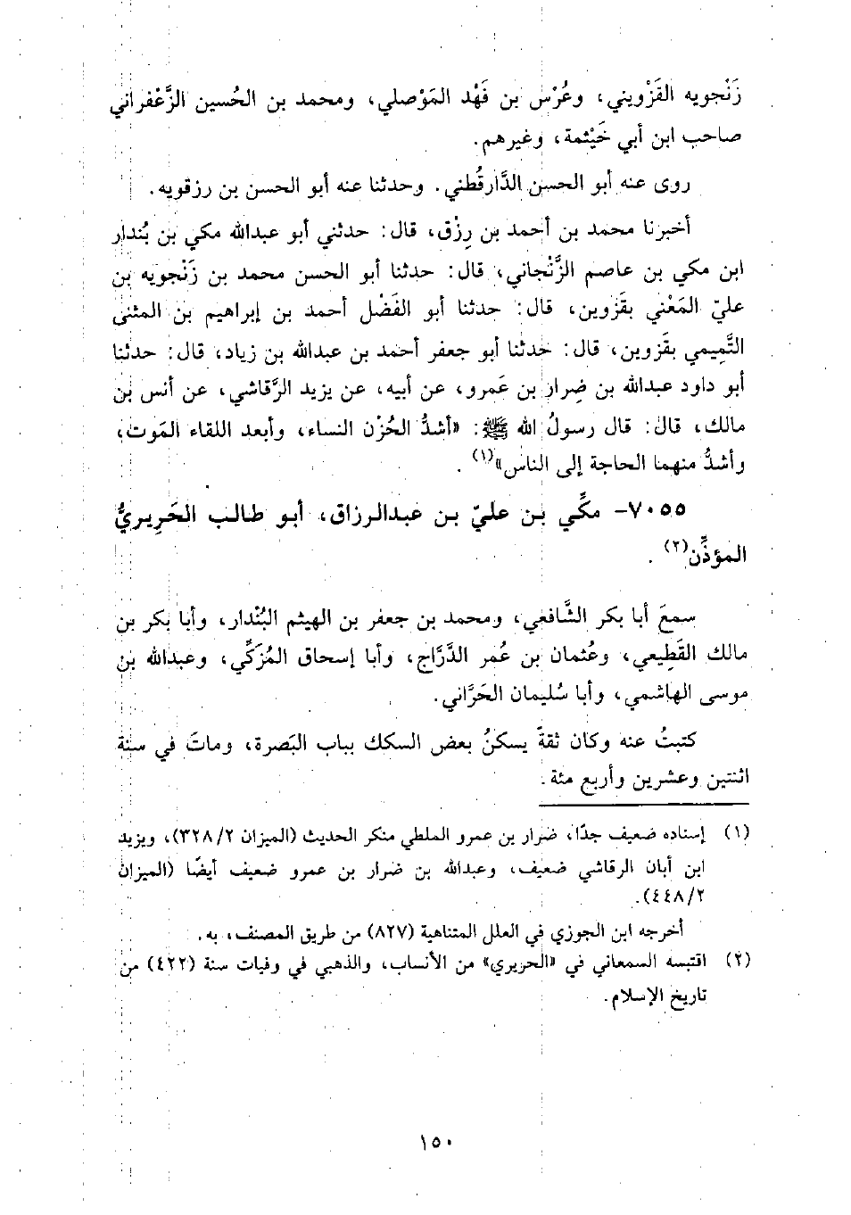 7055 - مكي بن علي بن عبد الرزاق أبو طالب الحريري المؤذن سمع: أبا بكر الشافعي، ومحمد بن جعفر بن الهيثم البندار، وأبا بكر بن مالك القطيعي، وعثمان بن عمر الدراج، وأبا إسحاق المزكي، وعبد الله بن موسى الهاشمي، وأبا سليمان الحراني، كتبت عنه، وكان ثقة، يسكن بعض السكك بباب البصرة، ومات في سنة اثنتين وعشرين وأربع مائة