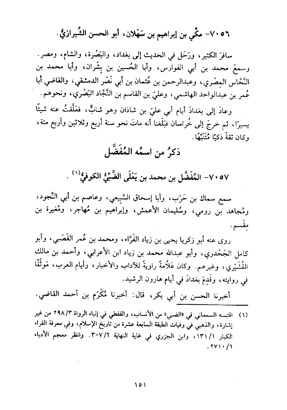 7056 - مكي بن إبراهيم بن سهلان أبو الحسن الشيرازي سافر الكثير، ورحل في الحديث إلى بغداد، والبصرة، والشام، ومصر.