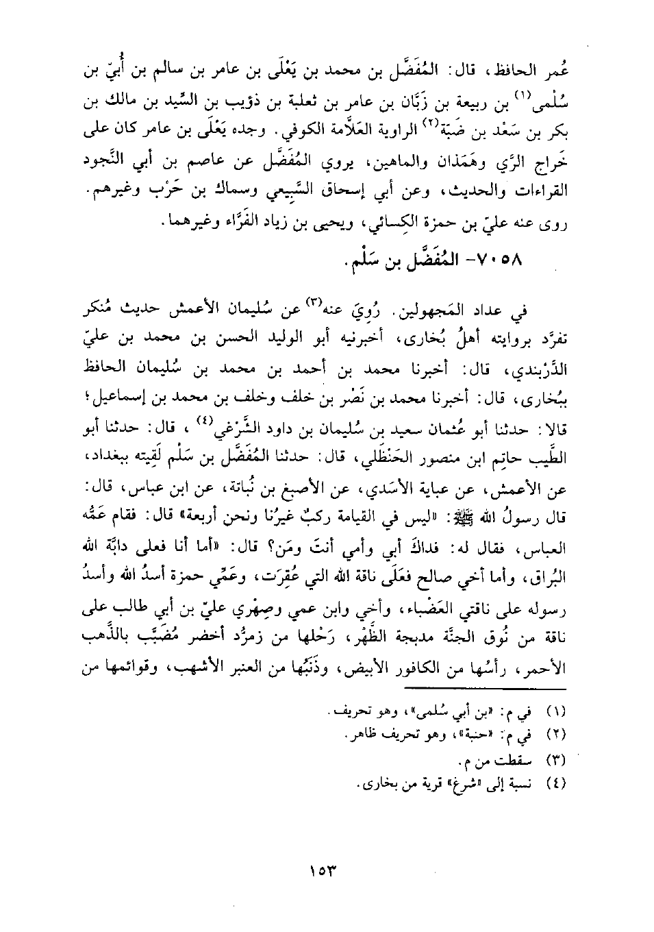 (4417) -[15: 153] أَخْبَرَنِيهِ أَبُو الْوَلِيدِ الْحَسَنُ بْنُ مُحَمَّدِ بْنِ عَلِيٍّ الدَّرْبَنْدِيُّ، قَالَ: أَخْبَرَنَا مُحَمَّدُ بْنُ أَحْمَدَ بْنِ مُحَمَّدِ بْنِ سُلَيْمَانَ الْحَافِظُ بِبُخَارَى، قَالَ: أَخْبَرَنَا مُحَمَّدُ بْنُ نَصْرِ بْنِ خَلَفٍ وَخَلَفُ بْنُ مُحَمَّدِ بْنِ إِسْمَاعِيلَ، قَالا: حَدَّثَنَا أَبُو عُثْمَانَ سَعِيدُ بْنُ سُلَيْمَانَ بْنِ دَاوُدَ الشَّرْغِيُّ، قَالَ: حَدَّثَنَا أَبُو الطَّيِّبِ حَاتِمُ بْنُ مَنْصُورٍ الْحَنْظَلِيُّ، قَالَ: حَدَّثَنَا الْمُفَضَّلُ بْنُ سَلْمٍ لَقِيتُهُ بِبَغْدَادَ، عَنِ الأَعْمَشِ، عَنْ عَبَايَةَ الأَسَدِيِّ، عَنِ الأَصْبَغِ بْنِ نُبَاتَةَ، عَنِ ابْنِ عَبَّاسٍ، قَالَ: قَالَ رَسُولُ اللَّهِ صَلَّى اللَّهُ عَلَيْهِ وَسَلَّمَ: " لَيْسَ فِي الْقِيَامَةِ رَكْبٌ غَيْرُنَا، وَنَحْنُ أَرْبَعَةٌ ".
