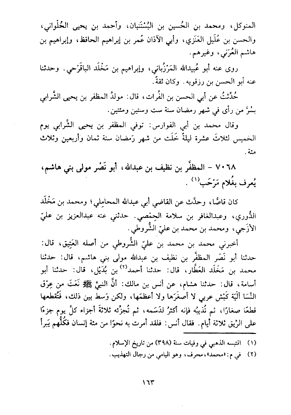 7068 - المظفر بن نظيف بن عبد الله أبو نصر مولى بني هاشم يعرف بغلام مرحب كان قاصا، وحدث عن: القاضي أبي عبد الله المحاملي، ومحمد بن مخلد الدوري، وعبد الغافر بن سلامة الحمصي، حَدَّثَنِي عنه: عبد العزيز بن علي الأزجي، ومحمد بن محمد بن علي الشروطي.