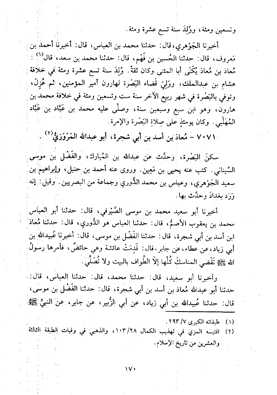 7071 - معاذ بن أسد بن أبي شجرة أبو عبد الله المروزي سكن البصرة، وحدث عن: عبد الله بن المبارك، والفضل بن موسى السيناني، كتب عنه: يحيى بن معين.