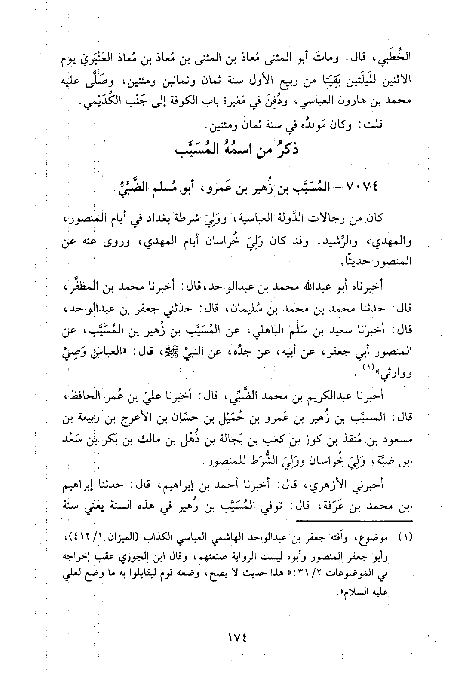 (4431) -[15: 174] أَخْبَرَنَاهُ أَبُو عَبْدِ اللَّهِ مُحَمَّدُ بْنُ عَبْدِ الْوَاحِدِ، قَالَ: أَخْبَرَنَا مُحَمَّدُ بْنُ الْمُظَفَّرِ، قَالَ: حَدَّثَنَا مُحَمَّدُ بْنُ مُحَمَّدِ بْنِ سُلَيْمَانَ، قَالَ: حَدَّثَنِي جَعْفَرُ بْنُ عَبْدِ الْوَاحِدِ، قَالَ: أَخْبَرَنَا سَعِيدُ بْنُ سَلْمٍ الْبَاهِلِيُّ، عَنِ الْمُسَيَّبِ بْنِ زُهَيْرِ بْنِ الْمُسَيَّبِ، عَنِ الْمَنْصُورِ أَبِي جَعْفَرٍ، عَنْ أَبِيهِ، عَنْ جَدِّهِ، عَنِ النَّبِيِّ صَلَّى اللَّهُ عَلَيْهِ وَسَلَّمَ قَالَ: " الْعَبَّاسُ وَصِيِّي وَوَارِثِي " أَخْبَرَنَا عبد الكريم بن محمد الضبي، قَالَ: أَخْبَرَنَا علي بن عمر الحافظ، قَالَ: المسيب بن زهير بن عمرو بن حميل بن حسان بن الأعرج بن ربيعة بن مسعود بن منقذ بن كوز بن كعب بن بجالة بن ذهل بن مالك بن بكر بن سعد بن ضبة، ولي خراسان، وولي الشرط للمنصور.