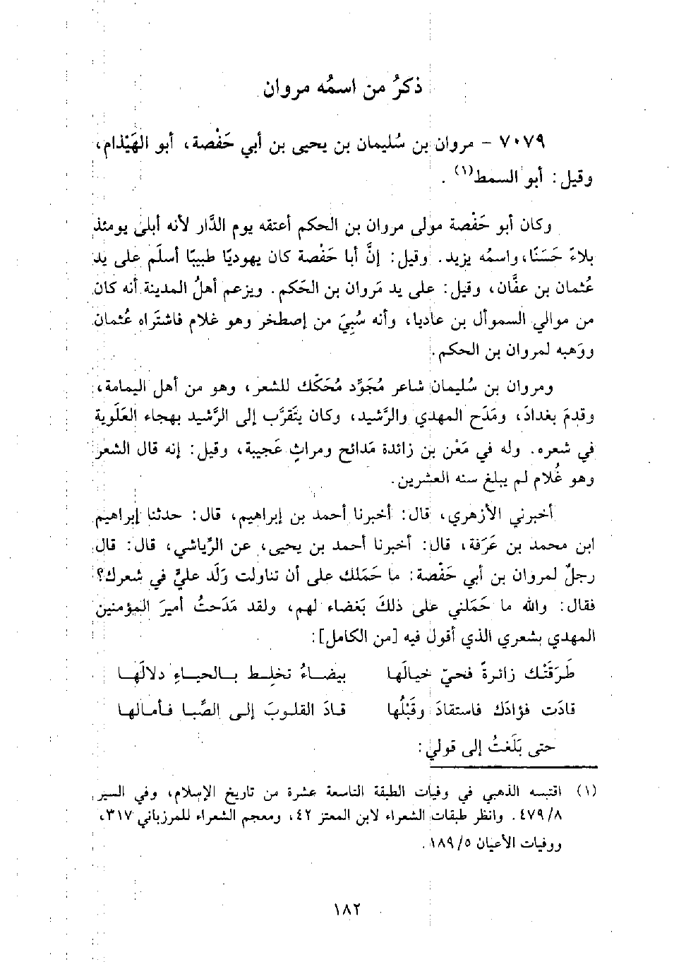أَخْبَرَنِي الأزهري، قَالَ: أَخْبَرَنَا أحمد بن إبراهيم، قَالَ: حَدَّثَنَا إبراهيم بن محمد بن عرفة، قَالَ: أَخْبَرَنَا أحمد بن يحيى، عن الرياشي، قَالَ: قَالَ رجل لمروان بن أبي حفصة: ما حملك على أن تناولت ولد علي في شعرك؟ فقال: والله ما حملني على ذلك بغضاء لهم، ولقد مدحت أمير المؤمنين المهدي بشعري الذي أقول فيه: