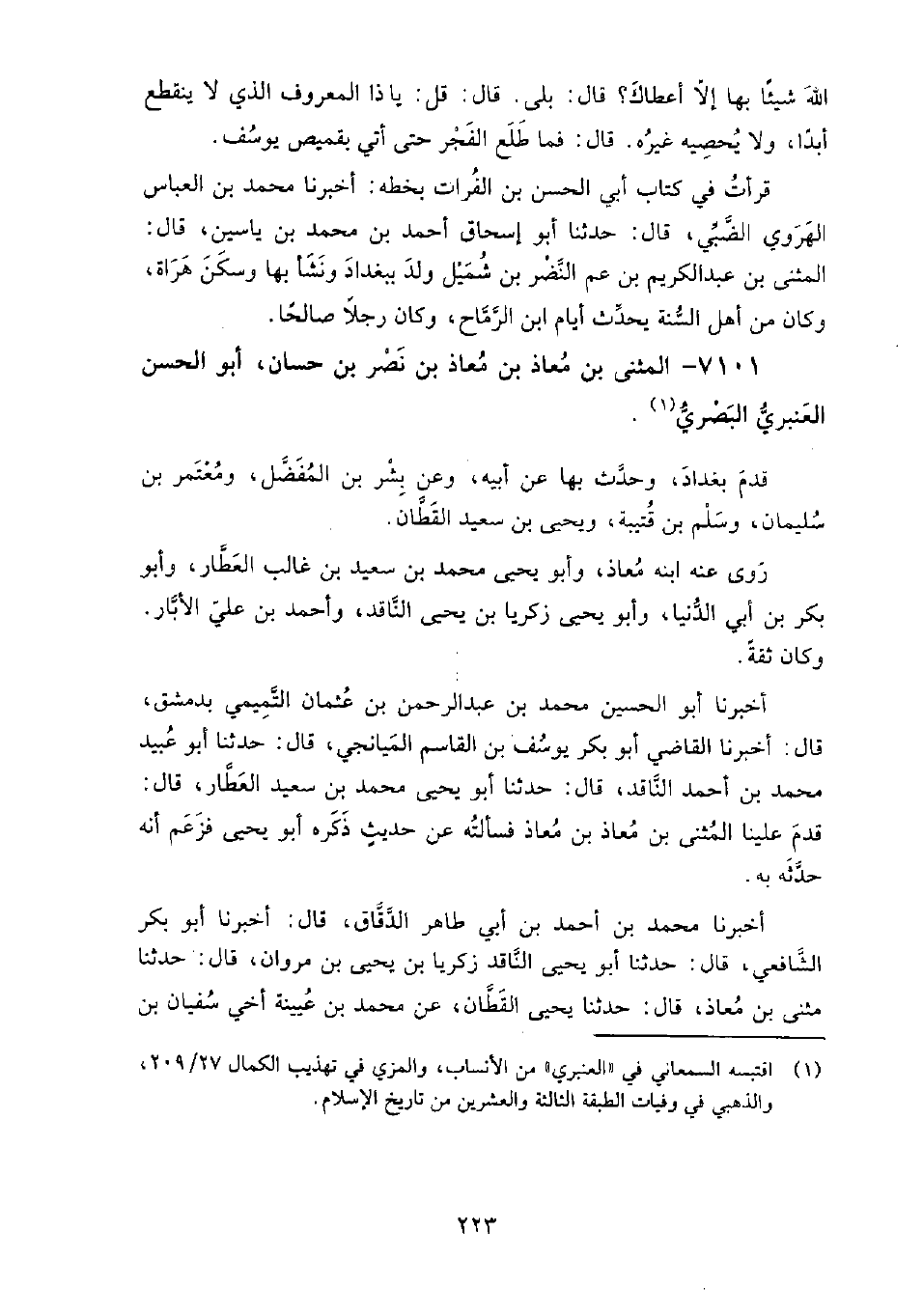 7101 - المثنى بن معاذ بن معاذ بن نصر بن حسان، أَبُو الحسن العنبري البصري قدم بغداد، وحدث بها عن أبيه، وعن بشر بن المفضل، ومعتمر بن سليمان، وسلم بن قتيبة، ويحيى بن سعيد القطان.