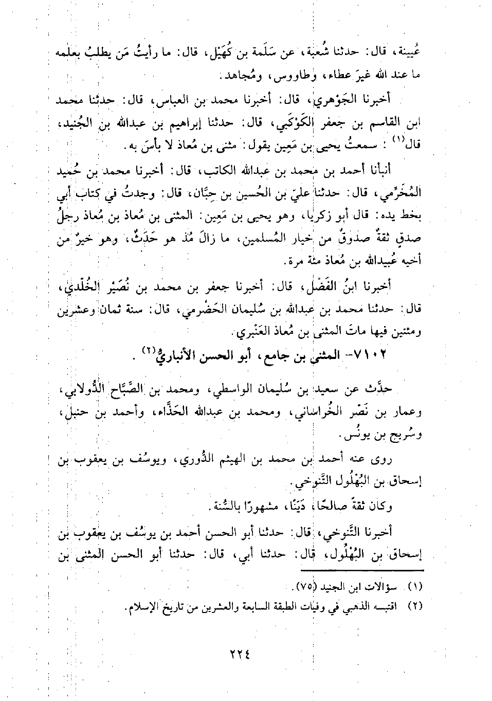 7102 - المثنى بن جامع، أَبُو الحسن الأنباري حدث عن: سعيد بن سليمان الواسطي، وَمُحَمَّد بن الصباح الدولابي، وعمار بن نصر الخراساني، وَمُحَمَّد بن عبد الله الحذاء، وأحمد بن حنبل، وسريج بن يونس.