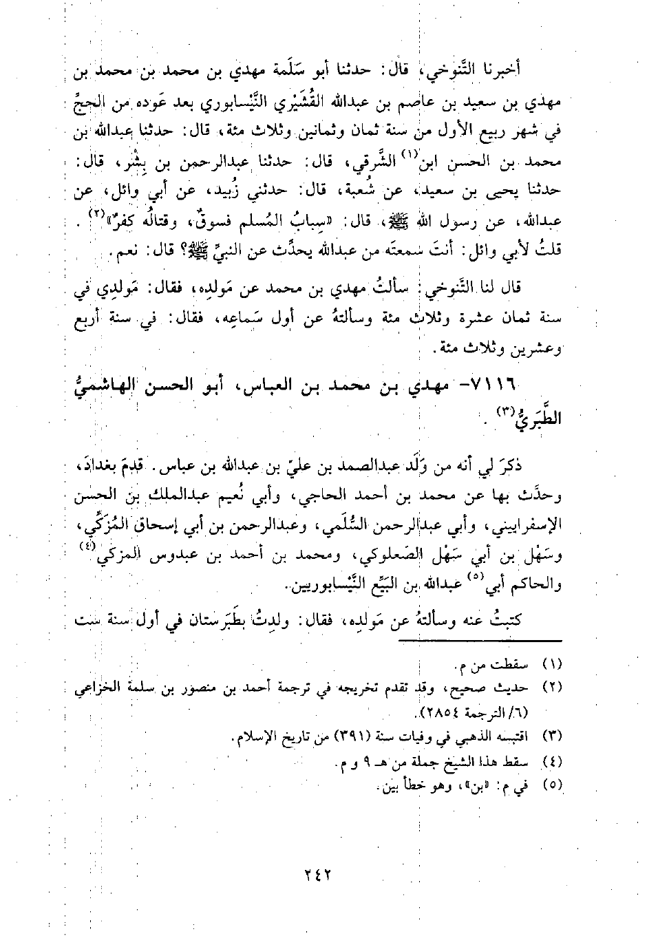 7116 - مهدي بن مُحَمَّد بن العباس، أَبُو الحسن الهاشمي الطبري ذكر لي أنه من ولد عبد الصمد بن علي بن عبد الله بن عباس، قدم بغداد، وحدث بها عن: مُحَمَّد بن أَحْمَد الحاجي، وأبي نعيم عبد الملك بن الحسن الإسفراييني، وأبي عَبْد الرَّحْمَن السلمي، وعَبْد الرَّحْمَن بن أبي إسحاق المزكي، وسهل بن أبي سهل الصعلوكي، وَمُحَمَّد بن أَحْمَد بن عَبْدُوس المُزَكِّي، والحاكم أَبِي عبد الله بن البيع النيسابوريين.