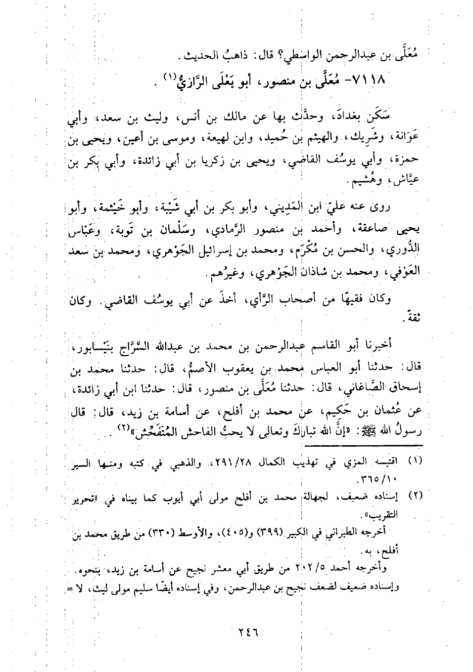 (4458) -[15: 246] أَخْبَرَنَا أَبُو الْقَاسِمِ عَبْدُ الرَّحْمَنِ بْنُ مُحَمَّدِ بْنِ عَبْدِ اللَّهِ السَّرَّاجُ، بِنَيْسَابُورَ، قَالَ: حَدَّثَنَا أَبُو الْعَبَّاسِ مُحَمَّدُ بْنُ يَعْقُوبَ الأَصَمُّ، قَالَ: حَدَّثَنَا مُحَمَّدُ بْنُ إِسْحَاقَ الصَّاغَانِيُّ، قَالَ: حَدَّثَنَا مُعَلَّى بْنُ مَنْصُورٍ، قَالَ: حَدَّثَنَا ابْنُ أَبِي زَائِدَةَ، عَنْ عُثْمَانَ بْنِ حَكِيمٍ، عَنْ مُحَمَّدِ بْنِ أَفْلَحَ، عَنْ أُسَامَةَ بْنِ زَيْدٍ، قَالَ: قَالَ رَسُولُ اللَّهِ صَلَّى اللَّهُ عَلَيْهِ وَسَلَّمَ: " إِنَّ اللَّهَ تَبَارَكَ وَتَعَالَى لا يُحِبُّ الْفَاحِشَ الْمُتَفَحِّشَ " أَخْبَرَنِي مُحَمَّد بن أَحْمَد بن يَعْقُوب، قَالَ: أَخْبَرَنَا مُحَمَّد بن نعيم الضبي، قَالَ: قرأت بخط أبي عمرو المستملي، قَالَ: حَدَّثَنِي سهل بن عمار، قَالَ: كنت عند المعلى بن منصور، وإبراهيم بن حرب النيسابوري في أيام خاض الناس في القرآن، فدخل علينا إبراهيم بن مقاتل المروزي يذكر للمعلى أن الناس قد خاضوا في أمره، قَالَ: في ماذا؟ قَالَ: يقولون إنك تقول القرآن مخلوق، فقال: ما قلته، ومن قَالَ: القرآن مخلوق فهو عندي كافر حدثت عن أبي الحسن مُحَمَّد بن العباس بن الفرات، قَالَ: أَخْبَرَنِي الحسن بن يوسف الصيرفي، قَالَ: أَخْبَرَنَا أَبُو بكر أَحْمَد بن مُحَمَّد بن هارون الخلال، قَالَ: أَخْبَرَنِي زكريا بن يحيى، قَالَ: حَدَّثَنَا أَبُو طالب، أنه سأل أبا عبد الله يعني: أَحْمَد بن حنبل عن المعلى بن منصور، قَالَ: كان يحدث بما وافق الرأي، وكان كل يوم يخطئ في حديثين وثلاثة، فكنت أجوزه إلى عبيد بن أبي قرة في قطيعة الربيع.