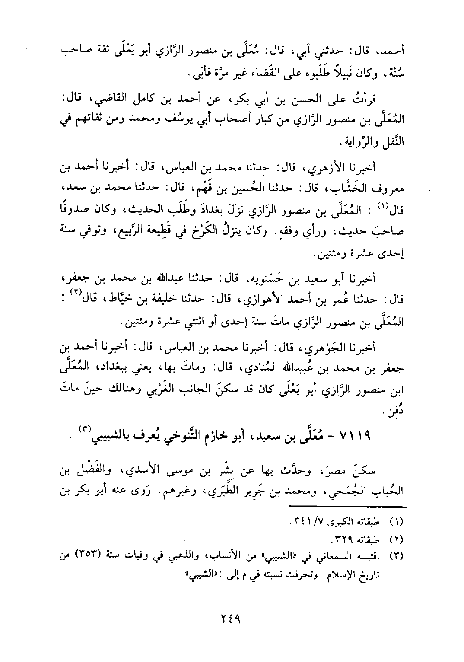 7119 - معلى بن سعيد أَبُو خازم التنوخي، يعرف بالشبيبي سكن مصر، وحدث بها عن: بشر بن موسى الأسدي، والفضل بن الحباب الجمحي، وَمُحَمَّد بن جرير الطبري، وغيرهم.