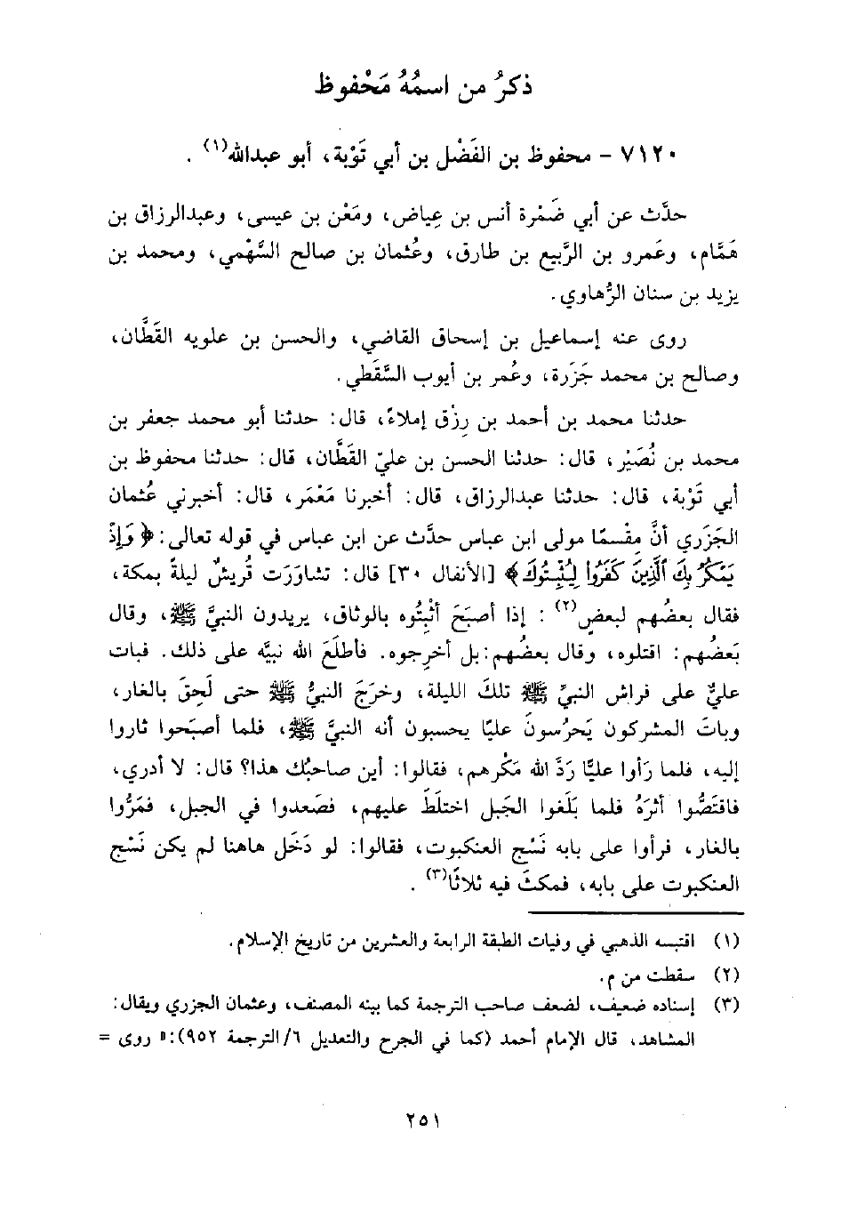 (4459) حَدَّثَنَا مُحَمَّدُ بْنُ أَحْمَدَ بْنِ رِزْقٍ إِمْلاءً، قَالَ: حَدَّثَنَا أَبُو مُحَمَّدٍ جَعْفَرُ بْنُ مُحَمَّدِ بْنِ نُصَيْرٍ، قَالَ: حَدَّثَنَا الْحَسَنُ بْنُ عَلِيٍّ الْقَطَّانُ، قَالَ: حَدَّثَنَا مَحْفُوظُ بْنُ أَبِي تَوْبَةَ، قَالَ: حَدَّثَنَا عَبْدُ الرَّزَّاقِ، قَالَ: أَخْبَرَنَا مَعْمَرٌ، قَالَ: أَخْبَرَنِي عُثْمَانُ الْجَزَرِيُّ، أَنَّ مِقْسَمًا مَوْلَى بْنِ عَبَّاسٍ، حَدَّثَ عَنِ ابْنِ عَبَّاسٍ فِي قَوْلِهِ تَعَالَى: {وَإِذْ يَمْكُرُ بِكَ الَّذِينَ كَفَرُوا لِيُثْبِتُوكَ}، قَالَ: " تَشَاوَرَتْ قُرَيْشٌ لَيْلَةً بِمَكَّةَ، فَقَالَ بَعْضُهُمْ لِبَعْضٍ: إِذَا أَصْبَحَ أَثْبِتُوهُ بِالْوَثَاقِ، يُرِيدُونَ النَّبِيَّ صَلَّى اللَّهُ عَلَيْهِ وَسَلَّمَ وَقَالَ بَعْضُهُمْ: اقْتُلُوهُ، وَقَالَ بَعْضُهُمْ: بَلْ أَخْرِجُوهُ، فَأَطْلَعَ اللَّهُ نَبِيَّهُ عَلَى ذَلِكَ، فَبَاتَ عَلِيٌّ عَلَى فِرَاشِ النَّبِيِّ صَلَّى اللَّهُ عَلَيْهِ وَسَلَّمَ تِلْكَ اللَّيْلَةَ، وَخَرَجَ النَّبِيُّ صَلَّى اللَّهُ عَلَيْهِ وَسَلَّمَ حَتَّى لَحِقَ بِالْغَارِ، وَبَاتَ الْمُشْرِكُونَ يَحْرُسُونَ عَلِيًّا يَحْسَبُونَ أَنَّهُ النَّبِيُّ صَلَّى اللَّهُ عَلَيْهِ وَسَلَّمَ فَلَمَّا أَصْبَحُوا ثَارُوا إِلَيْهِ، فَلَمَّا رَأَوْا عَلِيًّا رَدَّ اللَّهُ مَكْرَهُمْ، فَقَالُوا: أَيْنَ صَاحِبُكَ هَذَا؟ قَالَ: لا أَدْرِي، فَاقْتَصُّوا أَثَرَهُ، فَلَمَّا بَلَغُوا الْجَبَلَ اخْتَلَطَ عَلَيْهِمْ، فَصَعِدُوا فِي الْجَبَلِ، فَمَرُّوا بِالْغَارِ، فَرَأَوْا عَلَى بَابِهِ نَسْجَ الْعَنْكَبُوتِ، فَقَالُوا: لَوْ دَخَلَ هَاهُنَا لَمْ يَكُنْ نَسْجُ الْعَنْكَبُوتِ عَلَى بَابِهِ، فَمَكَثَ فِيهِ ثَلاثًا " أَخْبَرَنَا الأَزْهَرِيُّ، قَالَ: أَخْبَرَنَا أَبُو الحسن الدارقطني، قَالَ: محفوظ بن أبي توبة بغدادي أَخْبَرَنَا العتيقي، قَالَ: أَخْبَرَنَا يوسف بن أَحْمَد الصيدلاني، قَالَ: حَدَّثَنَا مُحَمَّد بن عمرو العقيلي، قَالَ: حَدَّثَنَا عبد الله بن أَحْمَد، قَالَ: سمعت أبي، يقول: محفوظ بن أبي توبة كان معنا باليمن، إلا أنه لم يكن يكتب كل ذلك، كان يسمع مع إبراهيم أخي أبان، ولم يكن ينسخ، وضعف أمره جدا أَخْبَرَنَا السمسار، قَالَ: أَخْبَرَنَا الصفار، قَالَ: حَدَّثَنَا عبد الباقي بن قانع أن محفوظ بن أبي توبة بغدادي، مات في سنة سبع وثلاثين ومائتين.