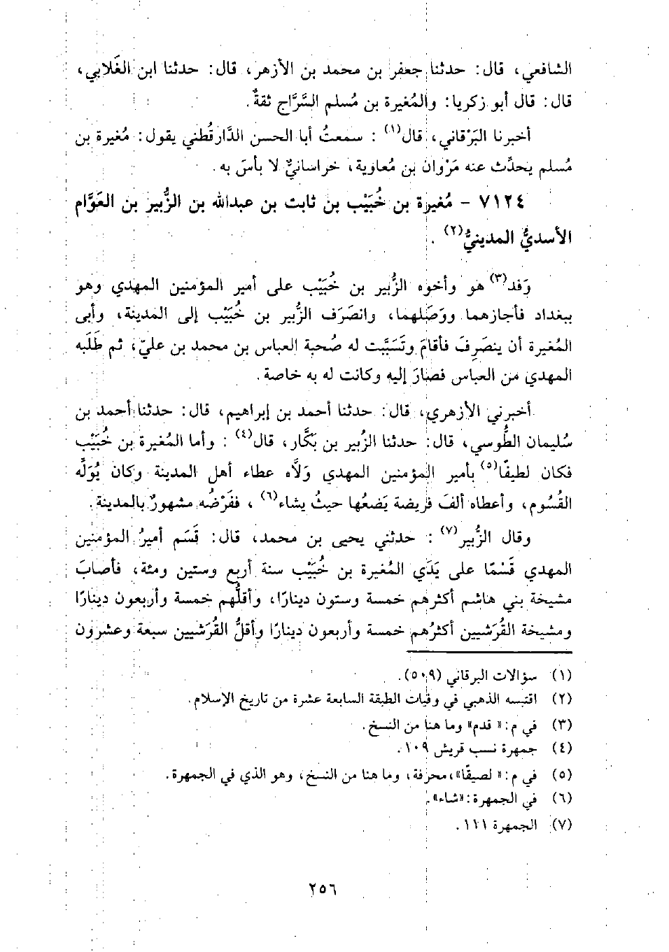 7124 - مغيرة بن خبيب بن ثابت بن عبد الله بن الزبير بن العوام الأسدي المديني وفد هو وأخوه الزبير بن خبيب على أمير المؤمنين المهدي وهو ببغداد، فأجازهما ووصلهما، وانصرف الزبير بن خبيب إلى المدينة، وأبي المغيرة أن ينصرف فأقام، وتسببت له صحبة العباس بن مُحَمَّد بن علي، ثم طلبه المهدي من العباس فصار إليه، وكانت له به خاصة.